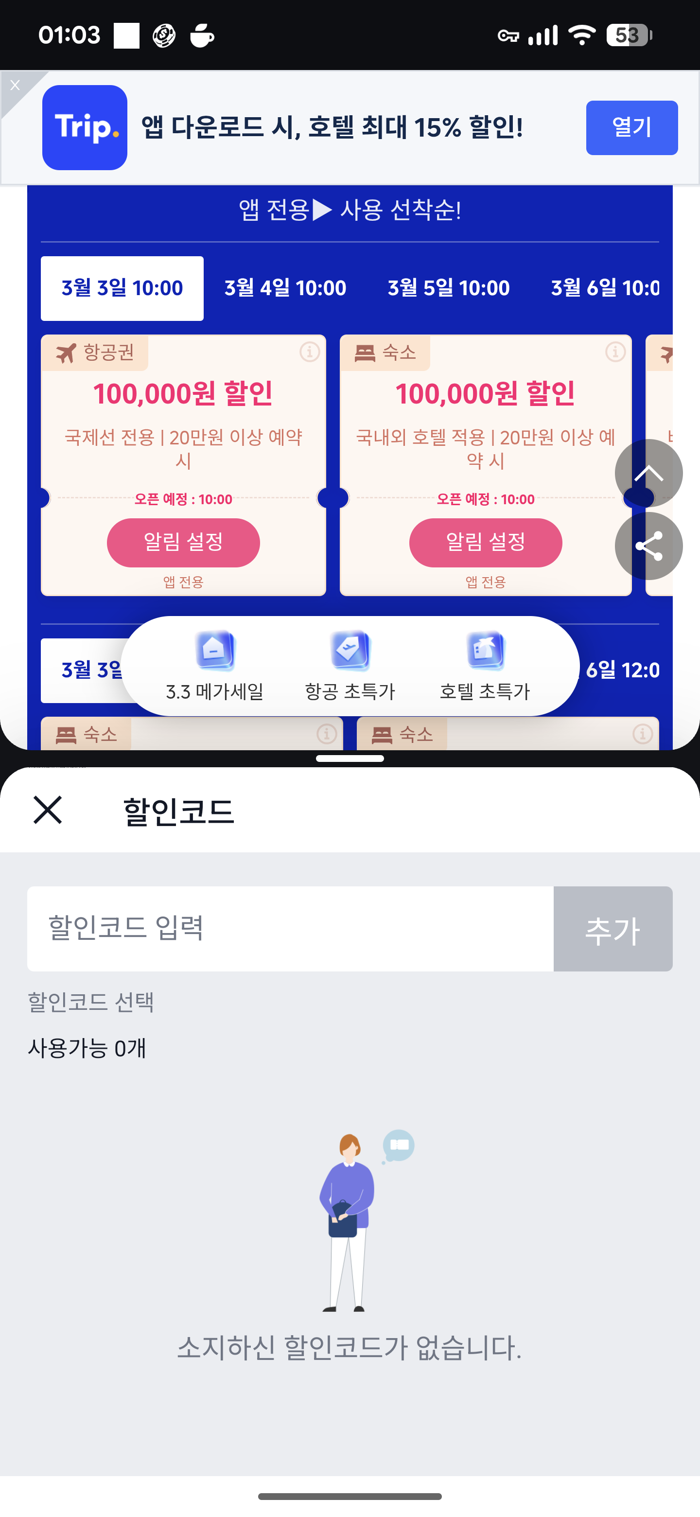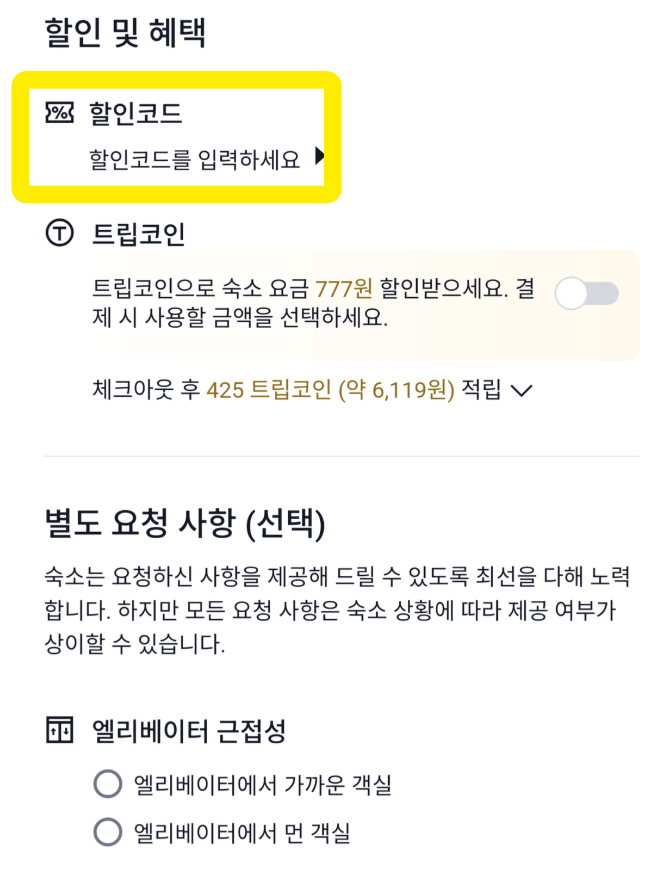 트립닷컴 앱에서 띄워놓는 할인 코드 입력 페이지는 [My 계정]에 있는 페이지가 아니고 원하는 호텔/항공권 결제 페이지에서 할인 코드 입력을 해야 합니다.