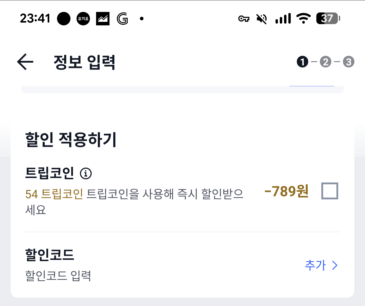 트립닷컴 앱으로는 예매하고 싶은 항공권을 검색해서 정보 입력 페이지에 있는 할인코드 입력까지 갑니다.