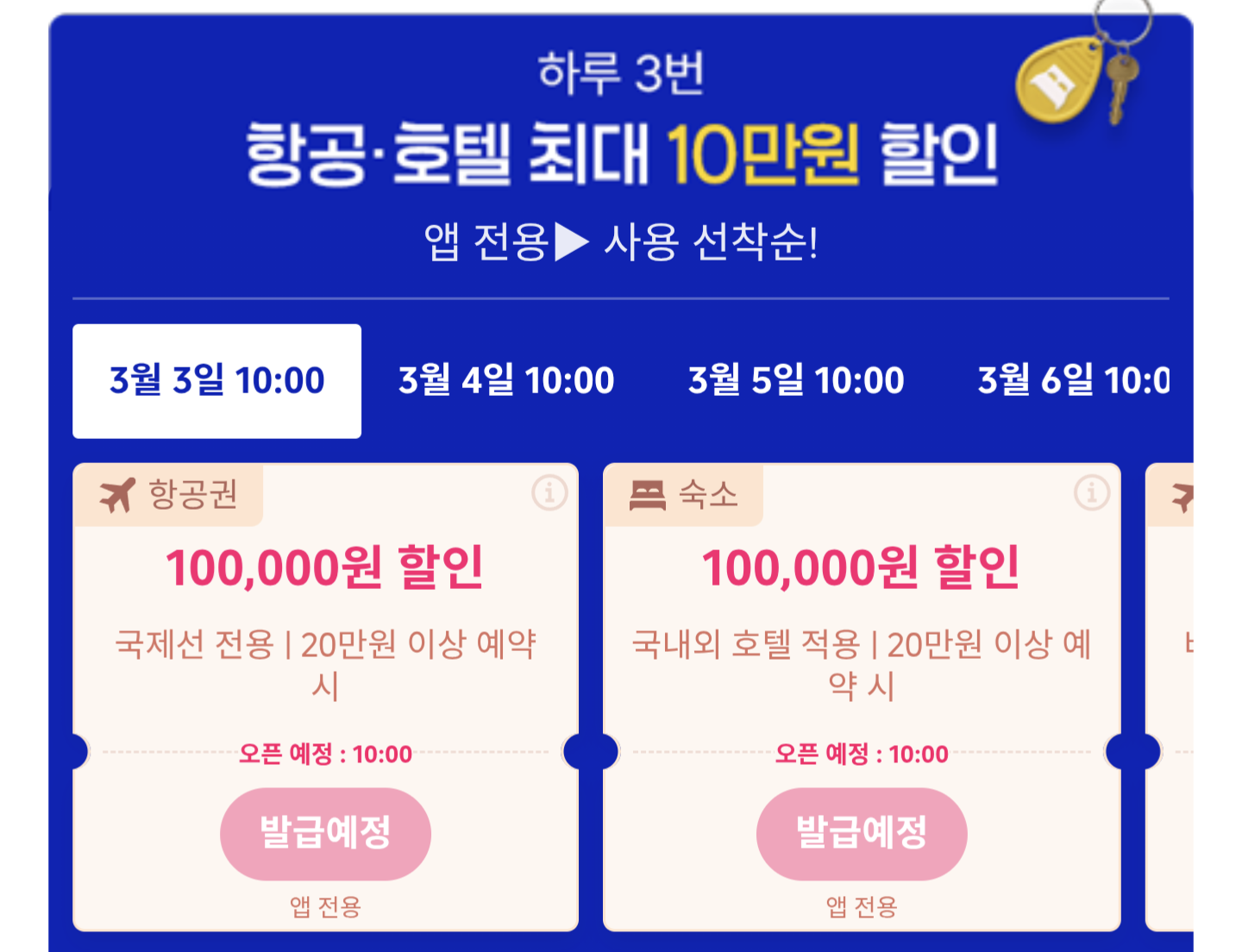 | ✈️ 항공권 특가 | 3/3(화): 제주 왕복, 오사카 편도 3,300원(오전 10시), 상하이/마카오 왕복 99,000원(오후 8시), 도쿄/홍콩 편도 13,000원(오후 10시) 3/5(목): 다낭 편도 13,000원(낮 12시), 방콕 편도(오후 8시) 3/6(금): 칭다오 왕복 49,000원(낮 12시) |