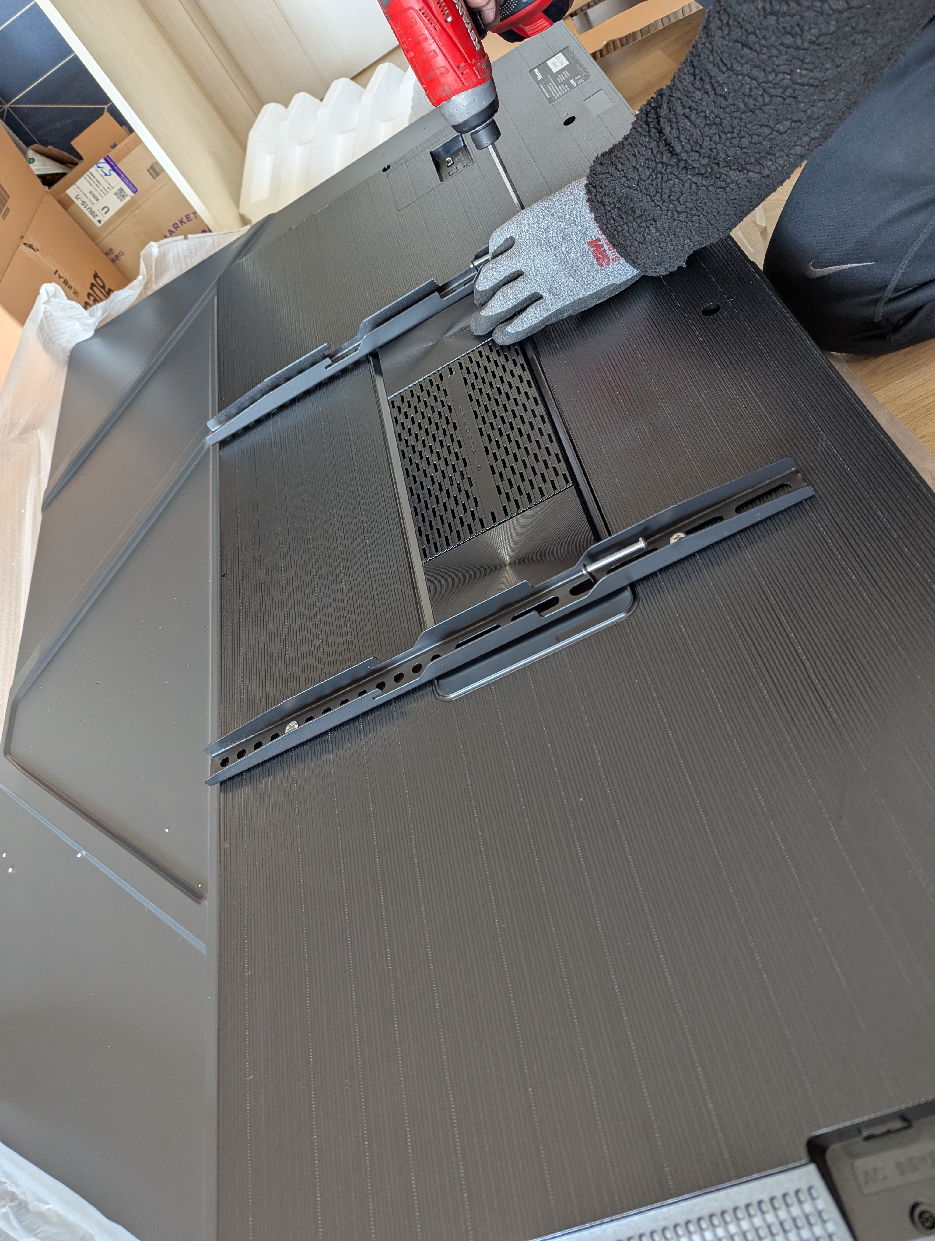 TV 구매 후 바로 다음날 설치 신청을 했는데, 쿠팡 답게 구매한 다음 날 바로 설치 기사님이 방문해 주셨습니다. 일반적으로 스탠드형으로 구매하면 동봉된 스탠드 조립까지만 해주시는 경우가 많은데, 저는 미리 이동식 거치대를 모두 조립해 두고 TV만 올리면 되는 상태로 준비해 두었습니다. 기사님께서 이 모습을 보시고는 원래는 안 되지만 이번에는 특별히 거치대 위에 올려주시는 작업까지 도와주셨습니다. 덕분에 아주 빠르고 문제없이 설치를 마칠 수 있었습니다.