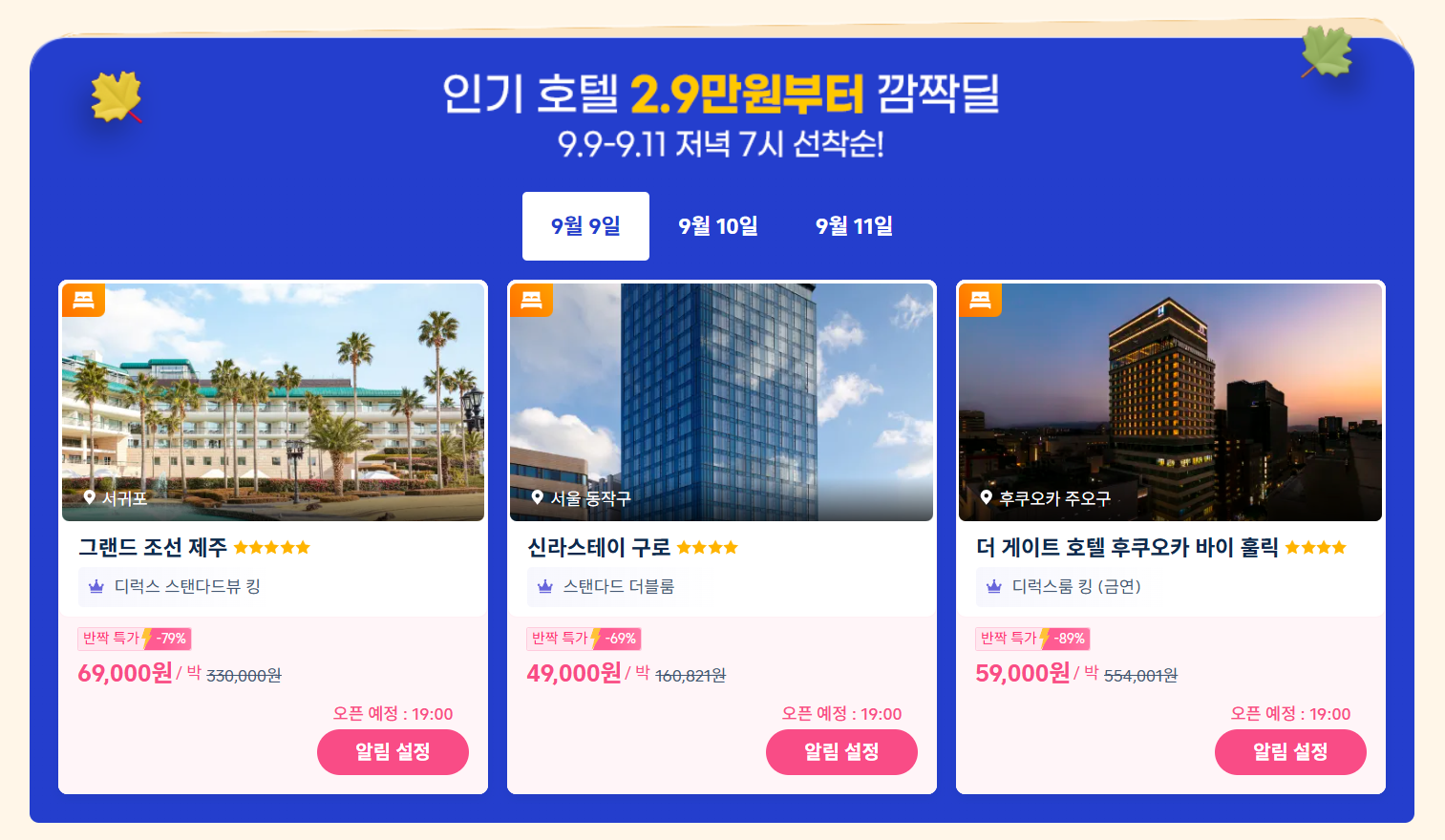 트립닷컴 9.9 메가세일은 특가 항공권 + 호텔 할인 + 티켓 프로모션이 하루에 몰려있는 이벤트입니다. 특히 시간대별로 오픈되는 상품이 달라 놓치지 않으려면 미리 접속해서 대기해두는 것이 좋습니다. 그리고 미리 정보를 입력해놔야하니까 꼭 위에 남겨 둔 예약 성공 방법을 확인하세요.