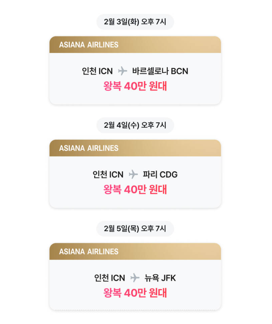 🔥 2월 3일(화) 11:00 - 아시아나 라이브 특가 행사 시작🇪🇸 2월 3일(화) 19:00 - 바르셀로나 왕복 40만원대 오픈 마감!🇫🇷 2월 4일(수) 19:00 - 파리 왕복 40만원대 오픈🇺🇸 2월 5일(목) 19:00 - 뉴욕 왕복 40만원대 오픈