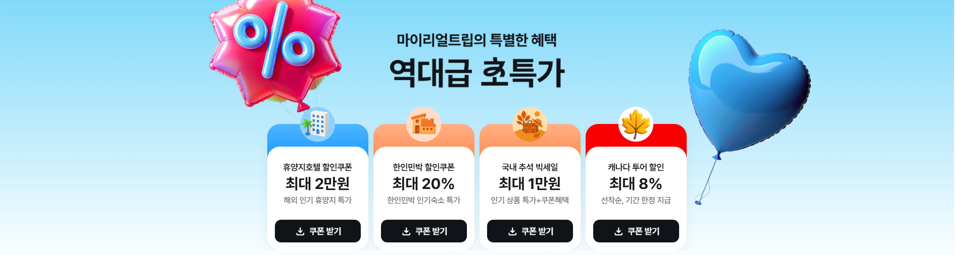 해외 인기 휴양지, 한인민박, 국내 추석 빅세일, 캐나다 투어 등 다양한 할인쿠폰을 한 번에 받을 수 있는 종합선물세트 같은 프로모션입니다. 어떤 여행을 계획하든 꼭 확인해보세요!