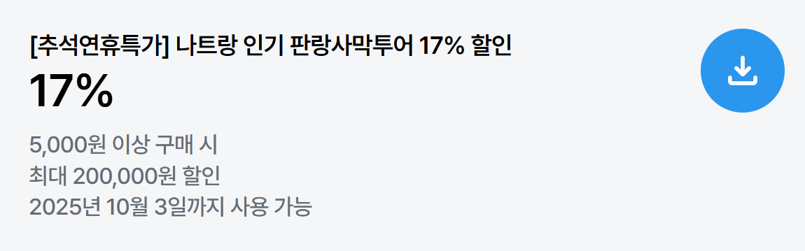 올 추석 연휴 나트랑 여행을 준비하시나요? 인기 판랑 사막 투어에 사용할 수 있는 17% 할인쿠폰입니다.