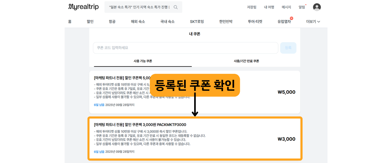 Step 2. '내 쿠폰' 목록에서 등록된 쿠폰들을 확인할 수 있습니다.