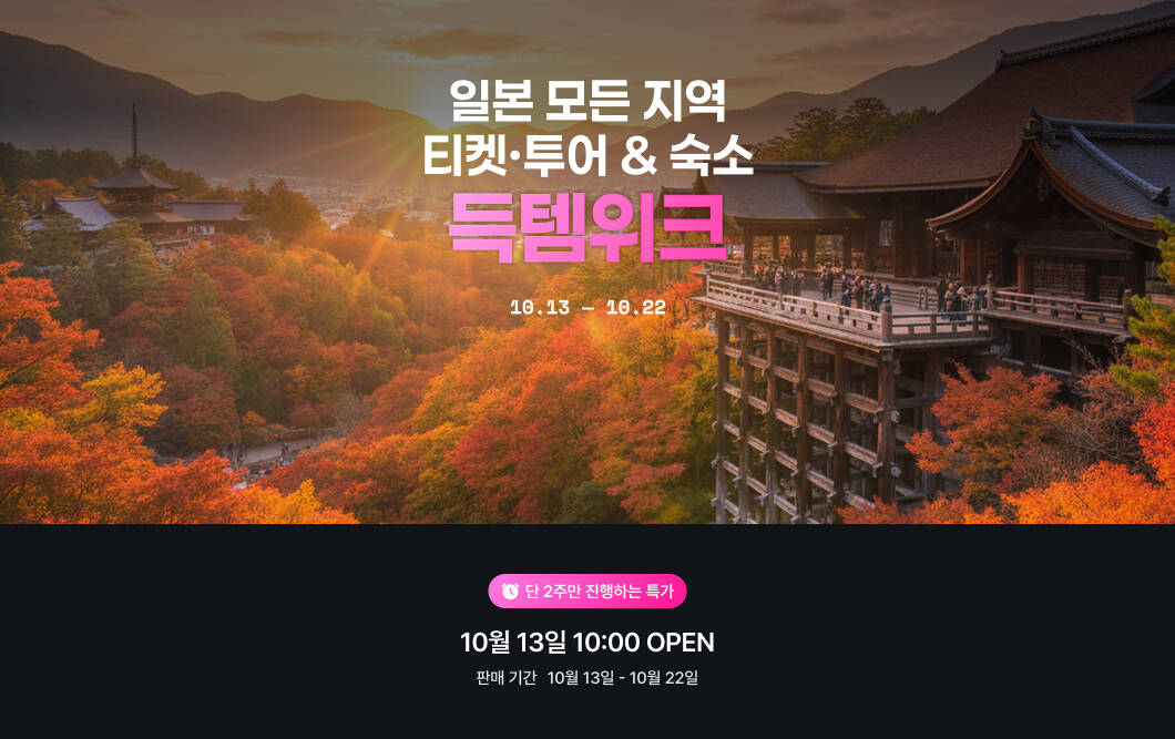 돌아오는 10월, 일본 여행을 위한 역대급 혜택! 티켓/투어 최대 50% 할인 쿠폰과 호텔/한인민박 할인 쿠폰이 제공될 예정입니다. 10월 13일 오전 10시 오픈이니 미리 준비하세요!