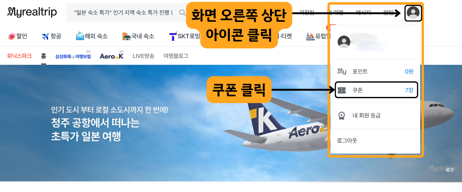 Step 1. 마이리얼트립 로그인 후, 오른쪽 위 사람 모양 아이콘 클릭 → '쿠폰' 선택