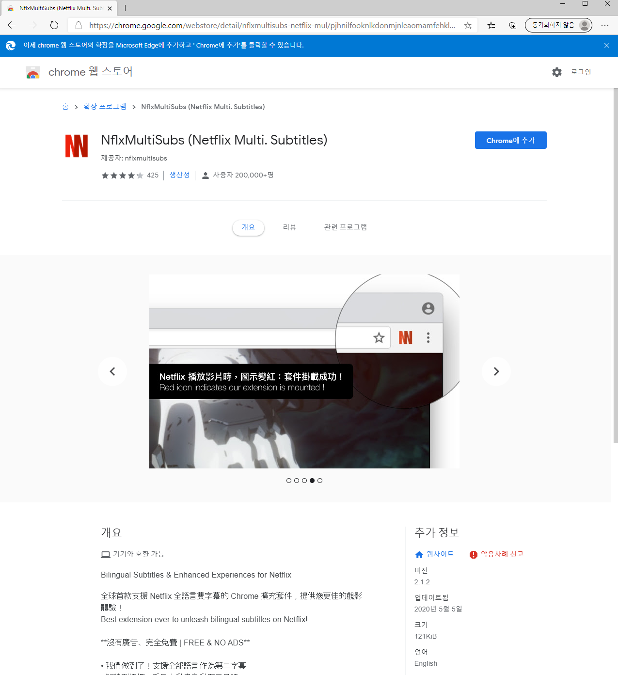 2023년도에 작동하는 넷플릭스 이중 자막 확장 프로그램은 아래 크롬 웹스토어에서 다운 가능합니다. 꼭 엣지로 접속해서 다운로드 받으세요.