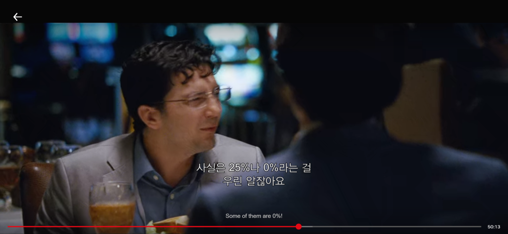 아무 영상이나 틀면 위와 같이 영어와 한글이 같이 보이는 자막을 확인하실 수 있습니다. 캡쳐는 넷플릭스의 정책상 화면 캡쳐가 안되어 까맣게 나오는 점 양해바랍니다.