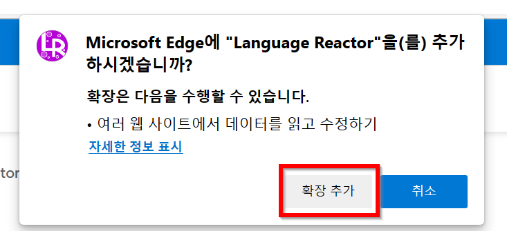 엣지에서 위 링크로 들어가 Langauage Reacter 확장 프로그램을 설치해줍니다. 크롬에서 들어가면 크롬에만 깔리기 때문에, 꼭 엣지를 이용해 위 주소로 들어가서 설치해야합니다. 'Chrome에서 추가' 버튼을 누르면, 엣지에 확장프로그램으로 추가됩니다.