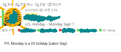 다음 주 월요일이 미국 공휴일이라 쉰다는 걸 한국 직원들한테 말해주려고 보낸 메일