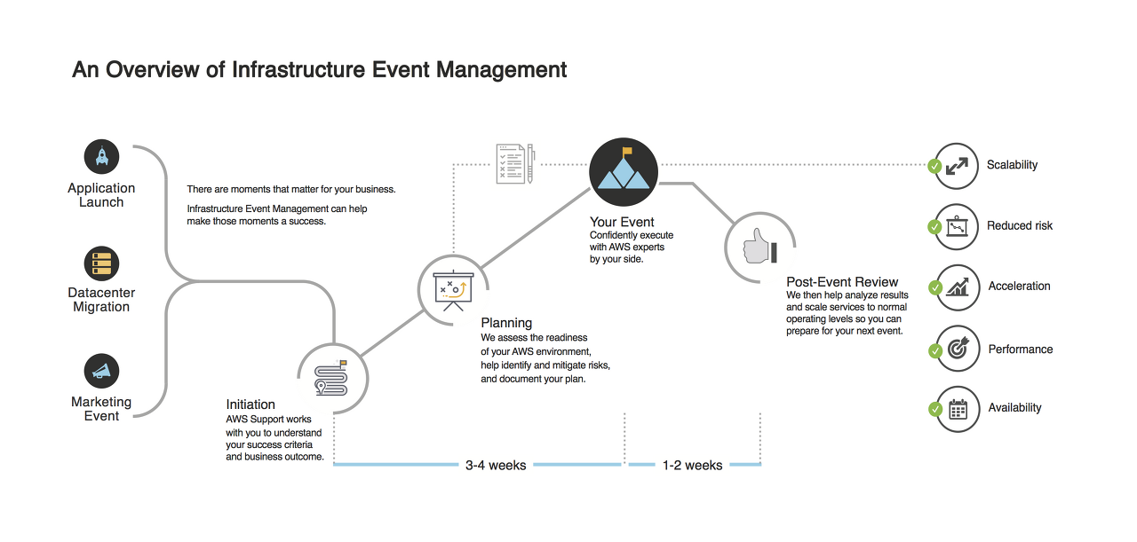 AWS 인프라 이벤트 관리는 엔터프라이즈 지원 고객 (및 비즈니스 지원 고객)이 제품 또는 애플리케이션 출시, 인프라 마이그레이션 및 마케팅 이벤트와 같은 대규모 이벤트를 계획하는데 도움이 되는 구조화 프로그램입니다.