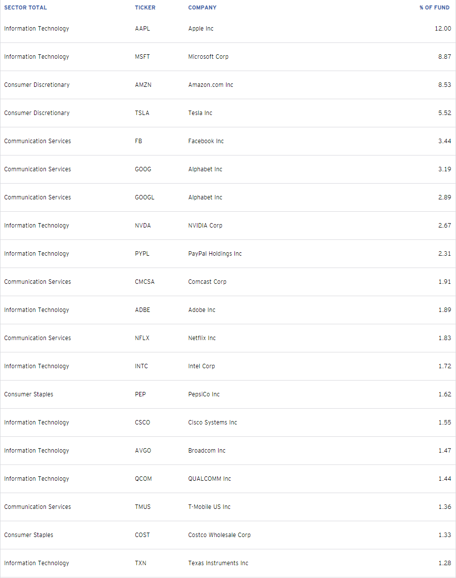 4. 설명하자면, NASDAQ에 상장된 103개 기업에 투자하고 있고 (2020년 6월 기준) 이를 Information Technology, Communication Services, Consumer Discretionary, Health Care, Consumer Staples, Industrials & Utilities 6개 섹터로 나누어 놨다.