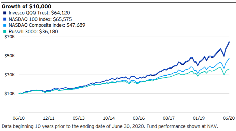 QQQ - Invesco QQQ Trust: Invesco사에서 운용하는 가장 기초 QQQ 상품으로써, NASDAQ-100 지표가 오르는 만큼 같이 오른다. 아래 표를 보면 2010년 6월 $10,000을 QQQ에 투자했다면 2020년 6월엔 $64,120의 가치를 갖는 것을 볼 수 있다. QQQ는 NASDAQ 추종 ETF인 만큼 기술주에 분산투자하고 있는데, 자세한 투자 회사, 지분은 아래 링크와 함께 공유해두었다.