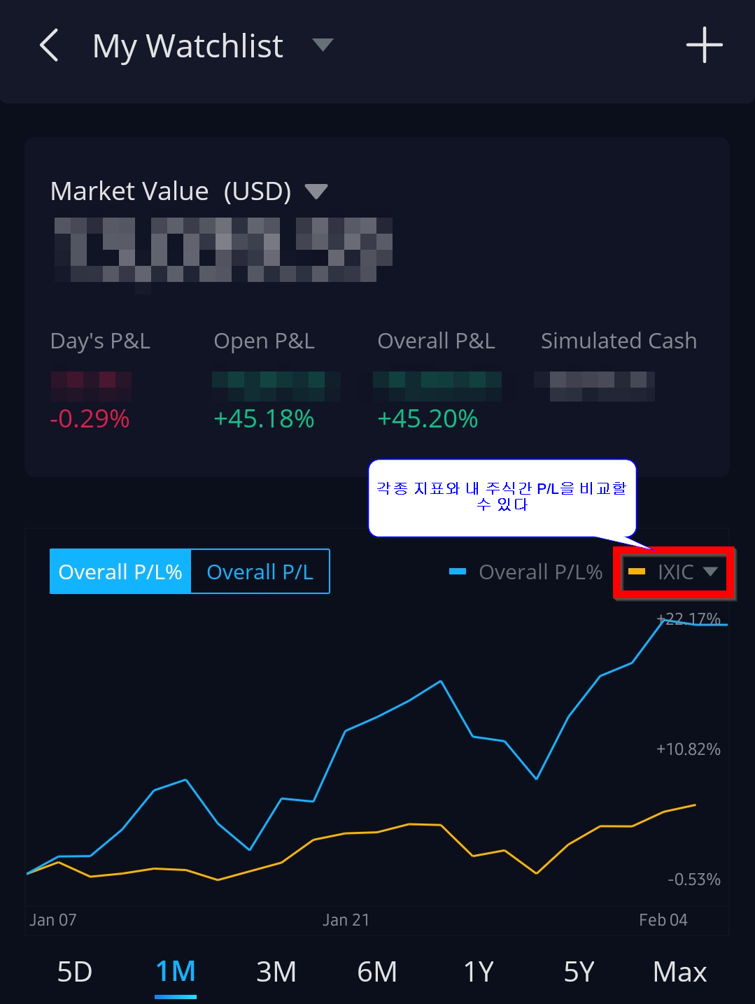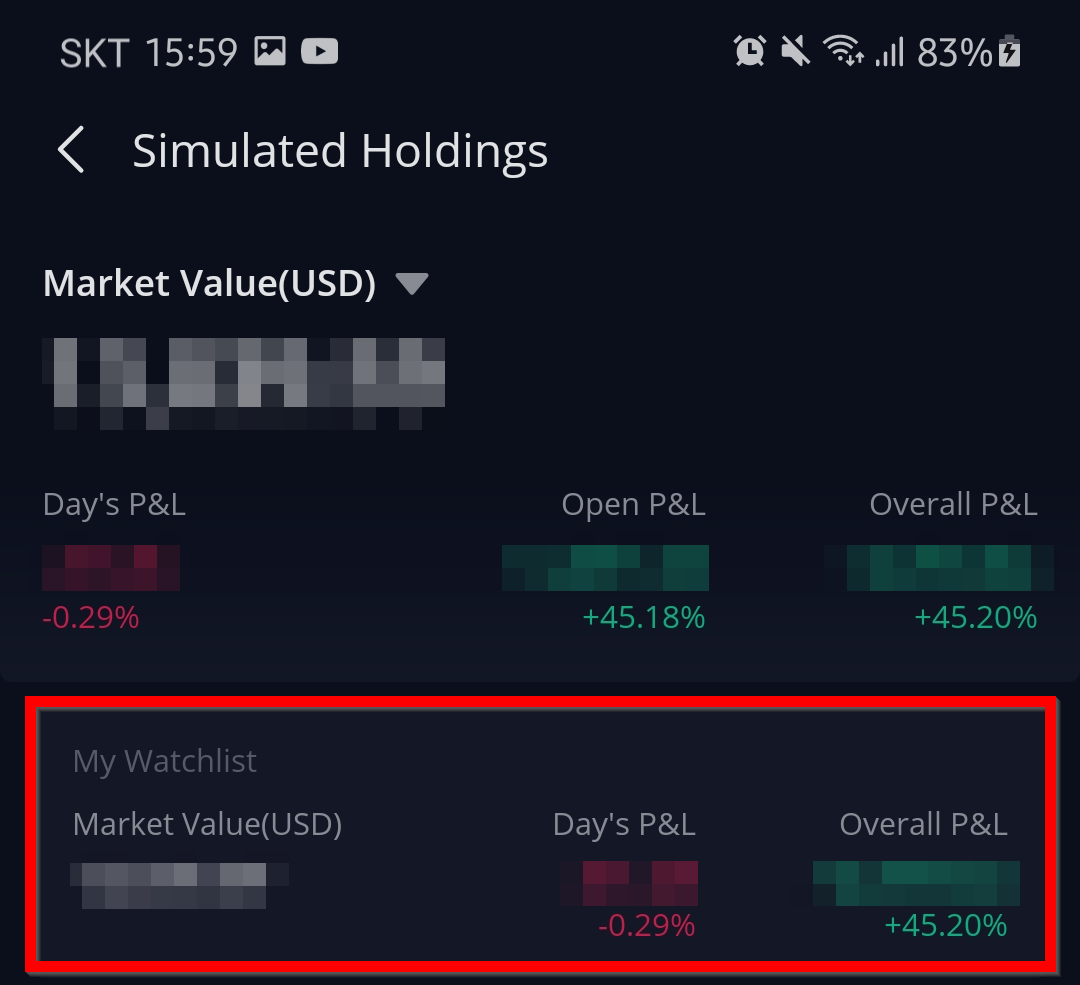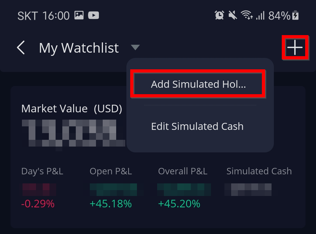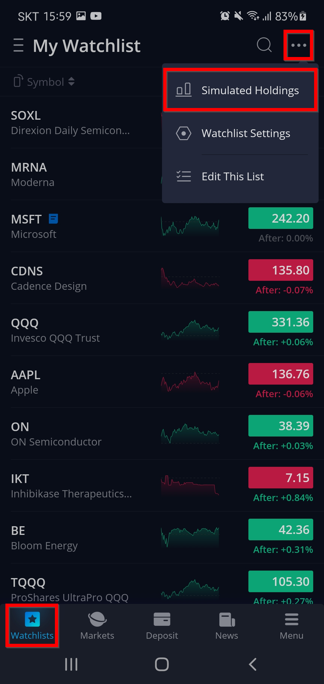 먼저 앱의 Watchlists 화면에서 오른쪽 상단 위 ...을 터치하면 나오는 Simulated Holdings 터치