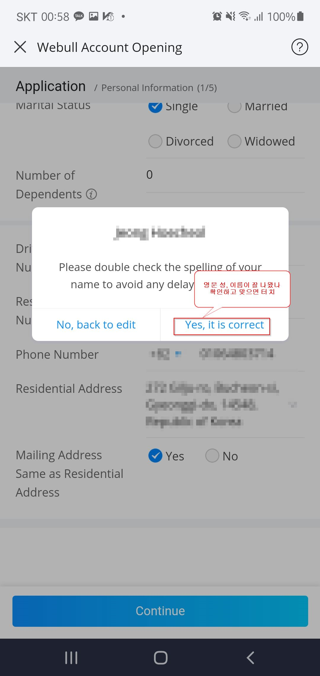 정보를 잘못 기입하면 계좌 만드는 게 오래 걸리니 오타를 잘 확인하라는 화면이 뜬다