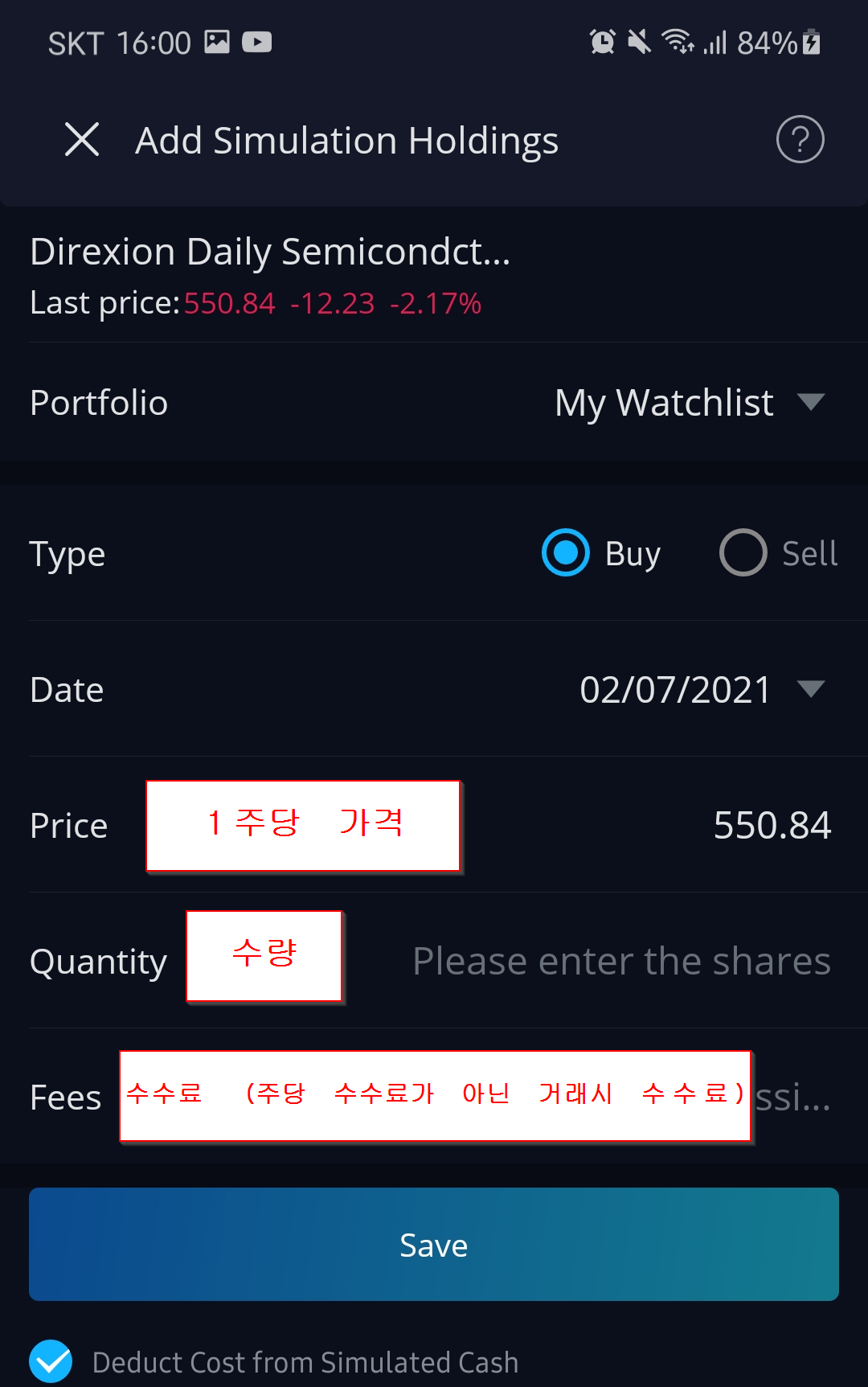 오른쪽 상단 + 표시를 터치하면 나오는 Add Simulated Holdings 터치