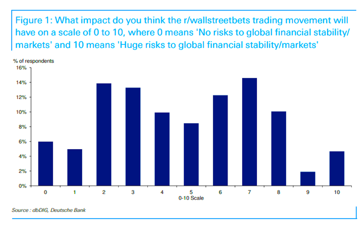 도이치뱅크의 Jim Reid는 이 사태의 위험성을 어떻게 인지하는지 0~10의 척도로 설문조사를 했는데 양 극단은 별로 없고, 2~4를 선택한 사람과 6~8을 선택한 사람의 비율이 같았다. 결국 불확실성이 크다는 얘기다.
