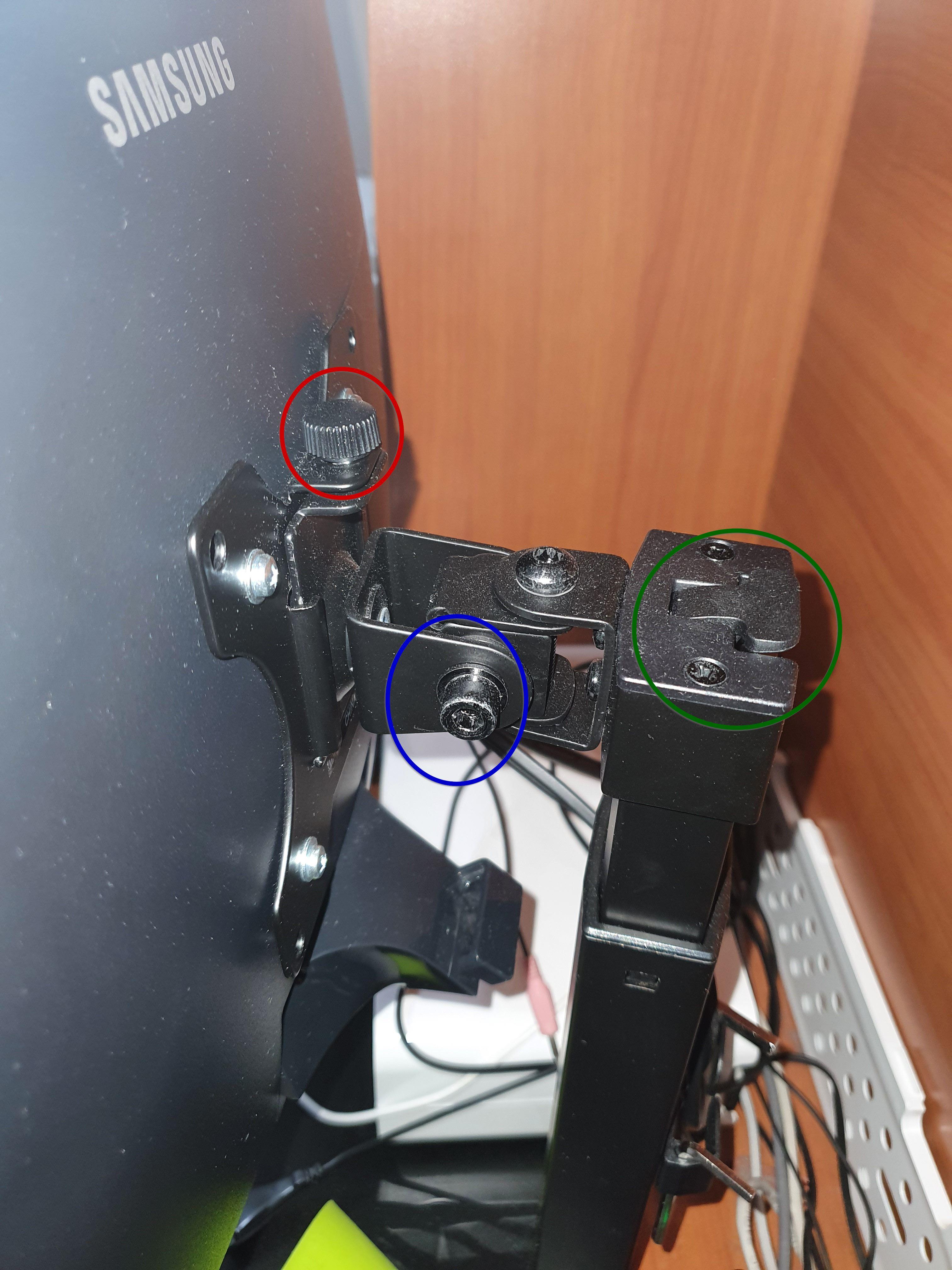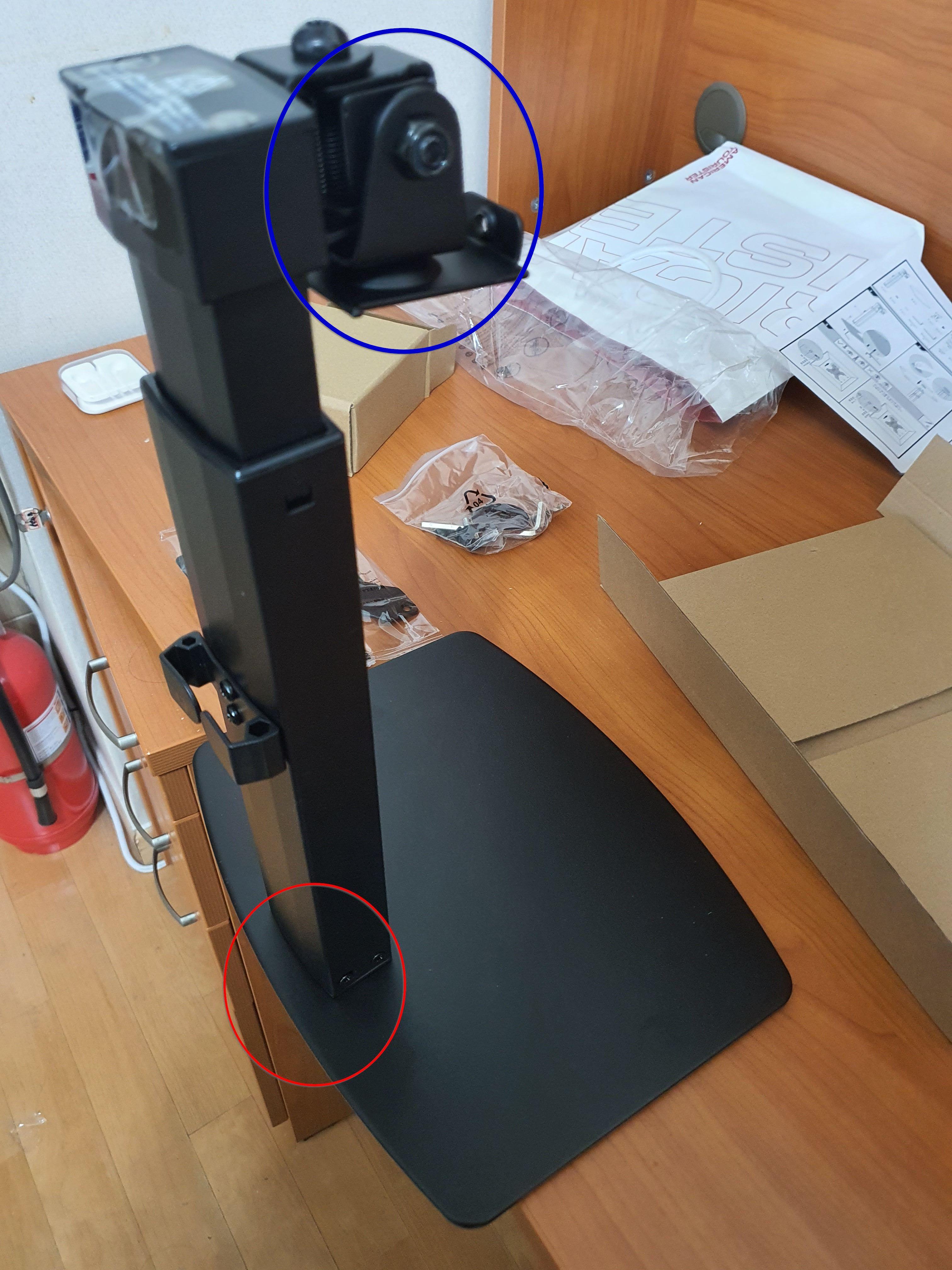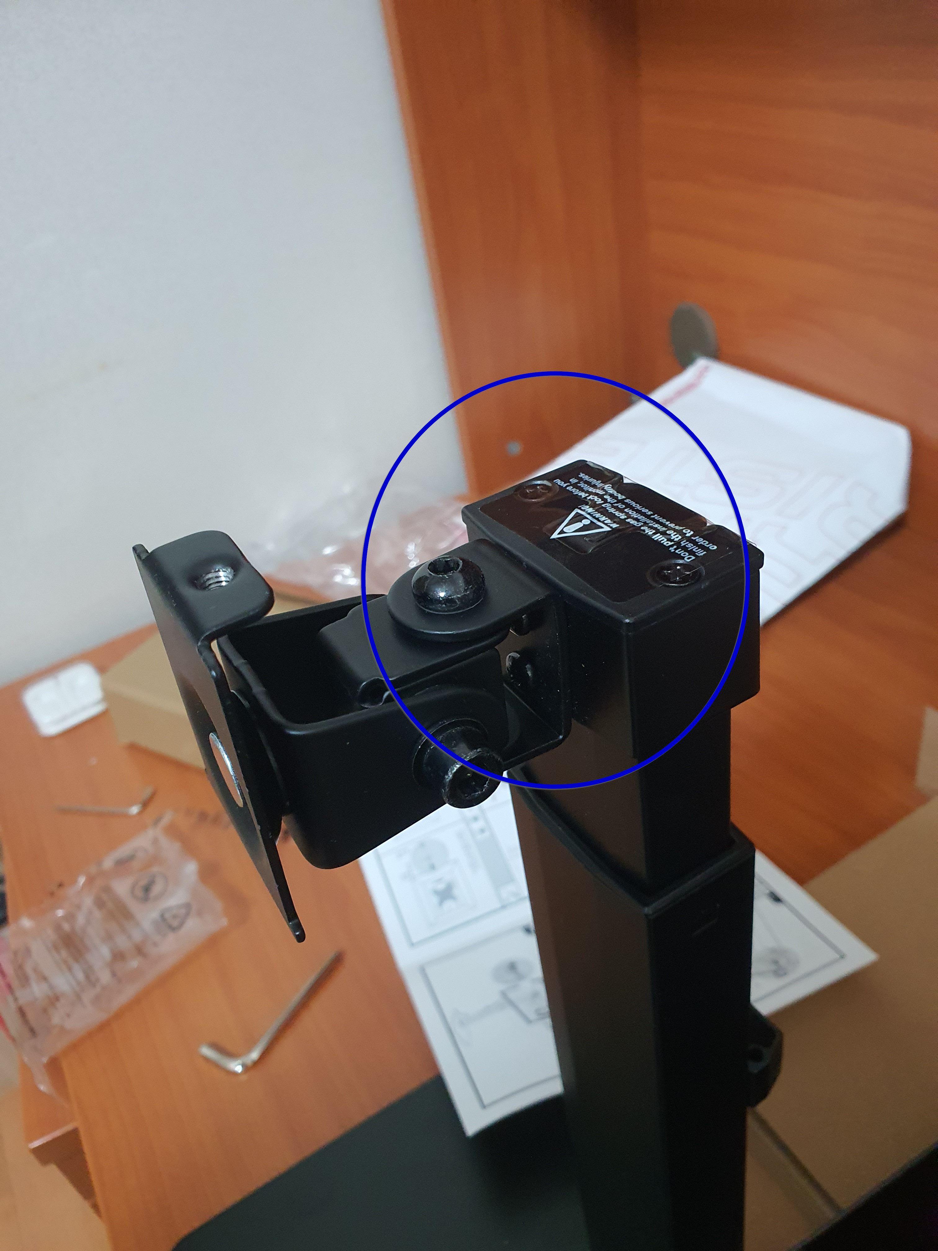 파란 원 - 저 나사를 약하게 조이면 모니터가 바로 고개를 숙여버리기 때문에 충분히 조여줘야 한다. 문제는 조이면 조일수록 고정되기 때문에 모니터를 움직이기는 힘들어진다. 이로 인해 모니터를 좌, 우로 회전시키면 기둥과 바닥판 자체가 같이 움직여버리는 상황을 볼 수 있다. 이를 어떻게든 방지하려고 저 나사를 풀면 모니터는 여지없이 고개 숙인다.