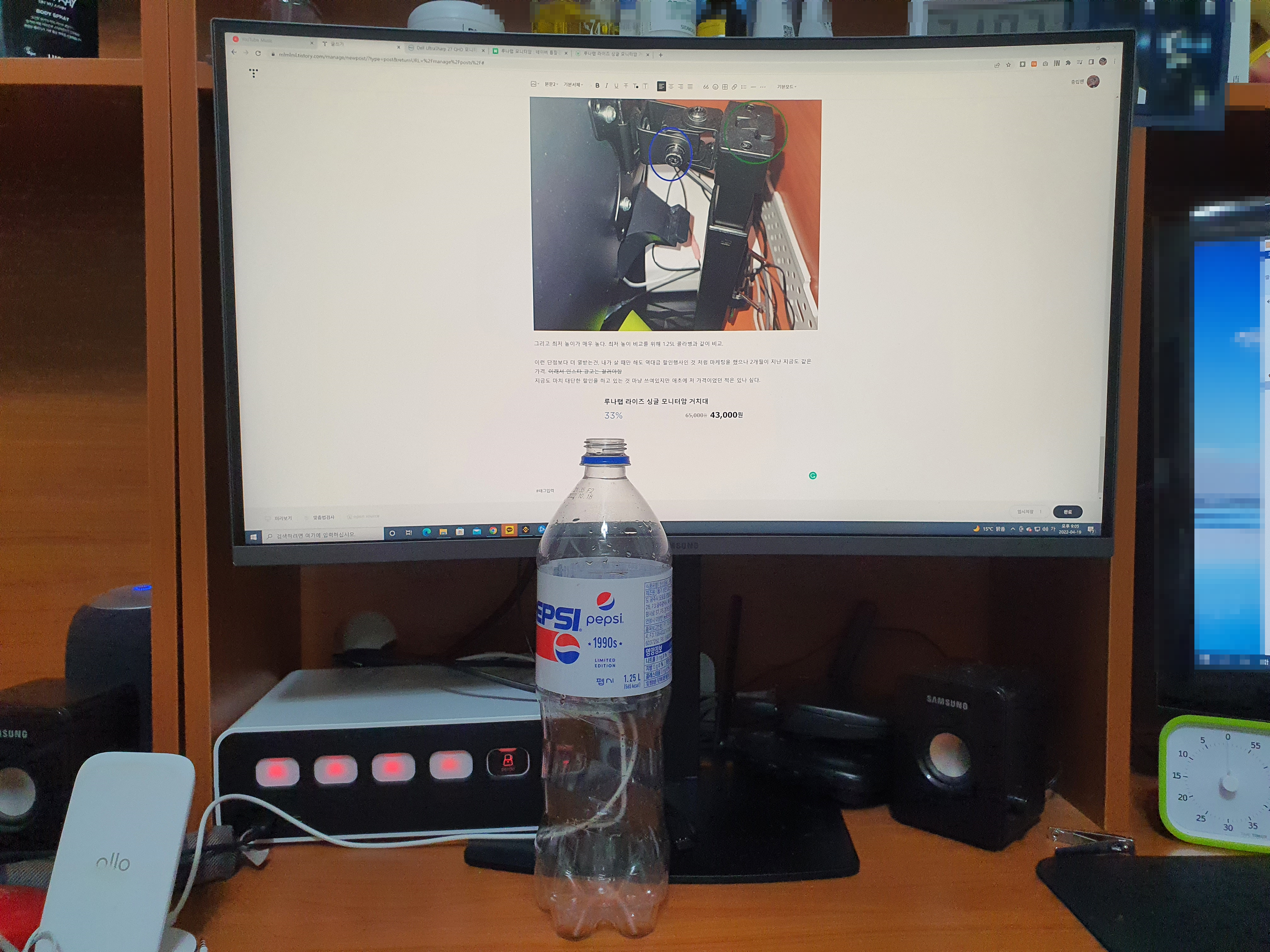 그리고 최저 높이가 매우 높다. 상품 설명에는 최저가 352mm라고 하는데 체감을 위해 1.25L 콜라병과 같이 비교. 특히나 내 모니터의 경우 베사홀이 모니터 정 중앙이 아닌 아래쪽으로 치우쳐져서 더 높게 느껴진다.