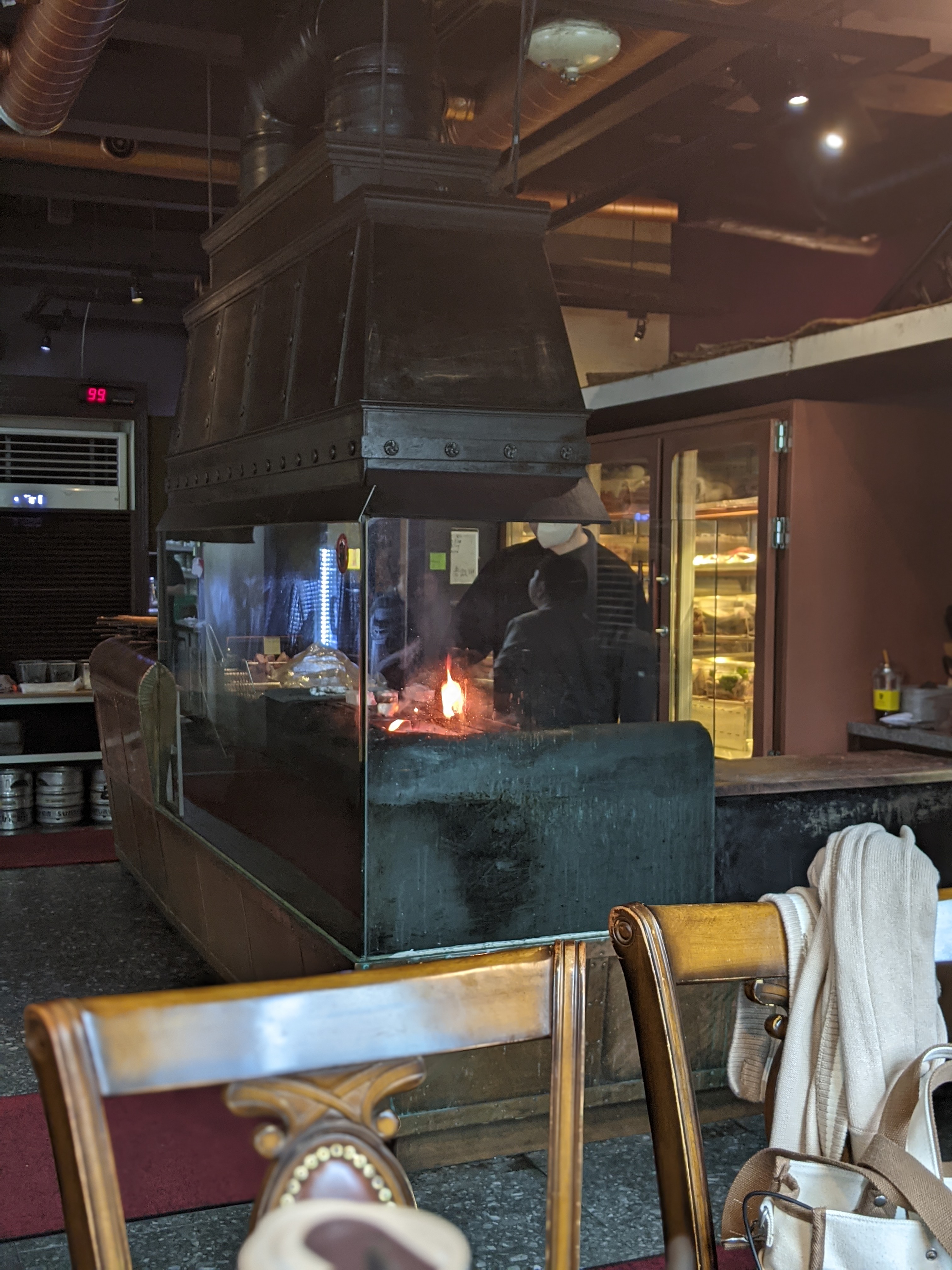 여기서 초벌로 구워져서 나온다. 모르는 사람 옆 테이블 옷과 가방이 그대로 사진에 노출될 정도로 그냥 붙어있음.
