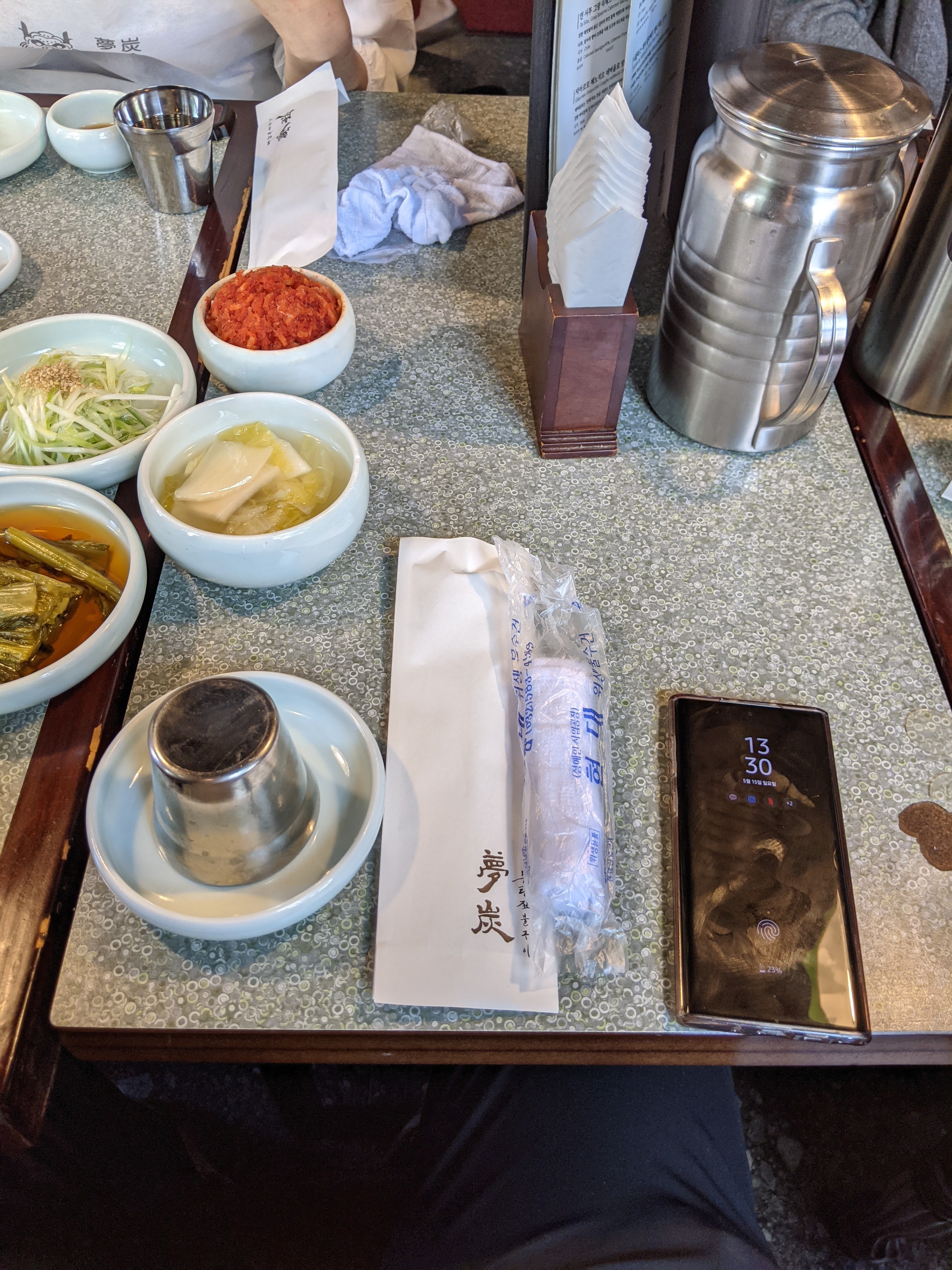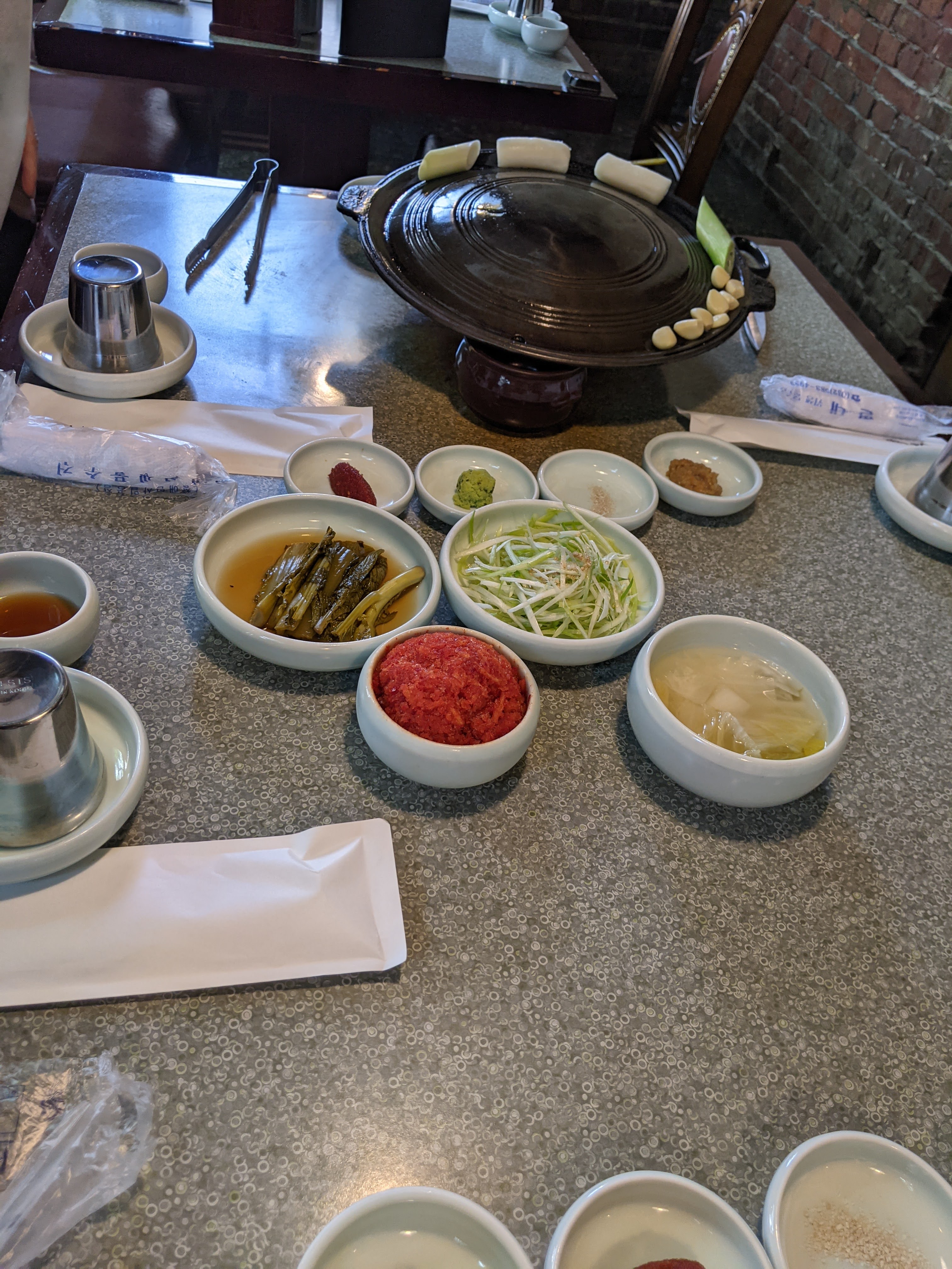 대충 이런 얘기다. 뭐 두 테이블을 쓰게 해주던가, 4인 테이블에 한자리 더 붙여주던가 하면 되지 굳이 5인 테이블을 말하니 난 뭐 따로 제대로 된 테이블이라도 있는 줄 알았다. 4인용 테이블 두 개 사이에 엄청나게 작은 간이 테이블 붙여 놓고, 한 명은 그 테이블과 테이블 사이에 앉아야 하는 처지다. 사진 찍으면 옆 분들도 다 보여서 못 찍음. 여차하면 모르는 옆 팀 테이블 고기 먹어도 됨. 이거 가지고 5인용이니 어쩌니 휴... 😅