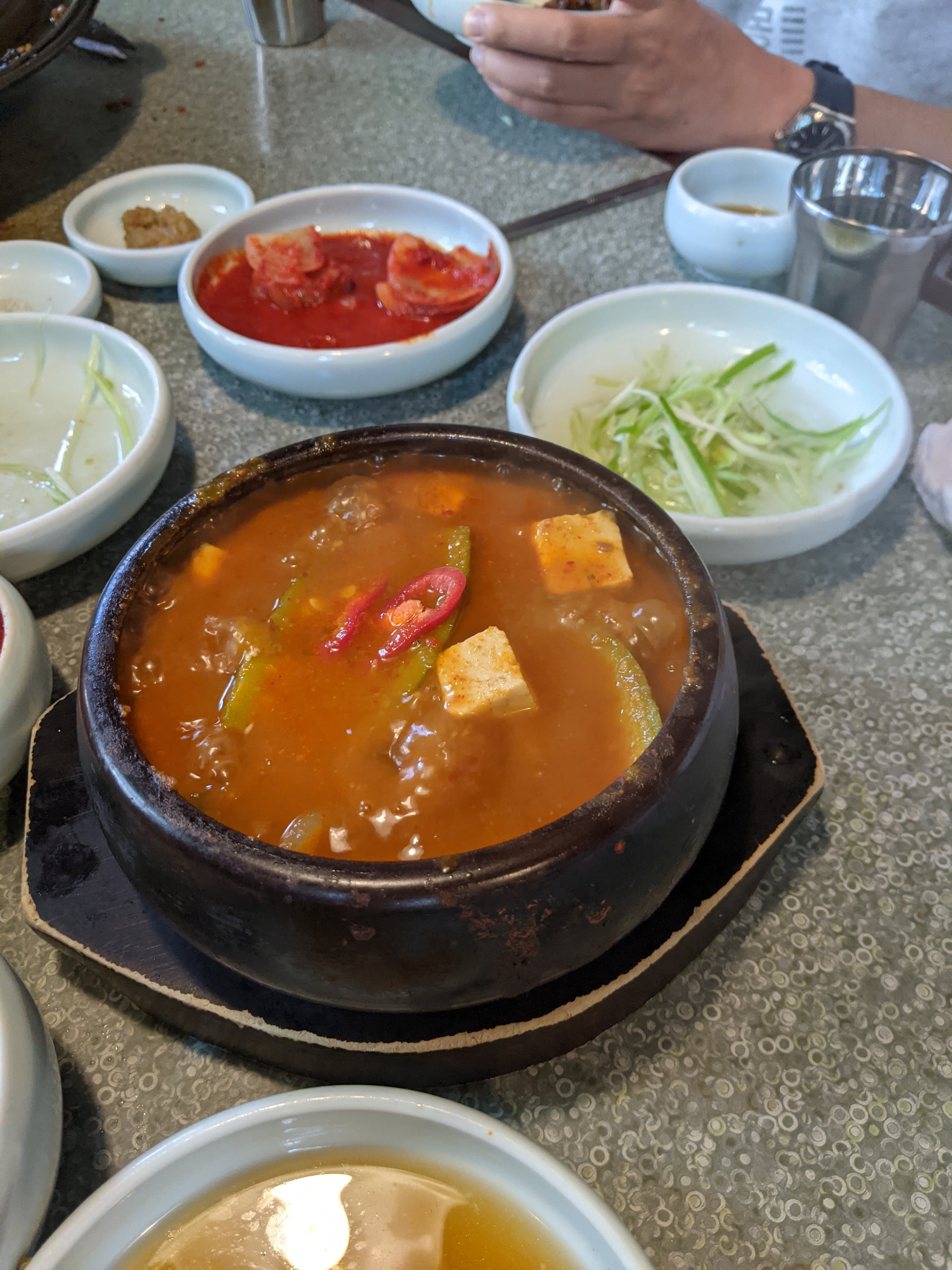마지막으로 된장찌개. 고깃집에서는 무조건 찌개류를 시켜줘야 한다. 안에 애호박이 크게 있는데, 우리에겐 그저 걸리적거리는 존재라 빼고 먹었다. 사진으로 보이는 것보다 그릇이 크고 깊어서 양이 많고 얼큰하니 맛있다. 냉면은 아빠가 먹어서 따로 찍지는 못했다.
