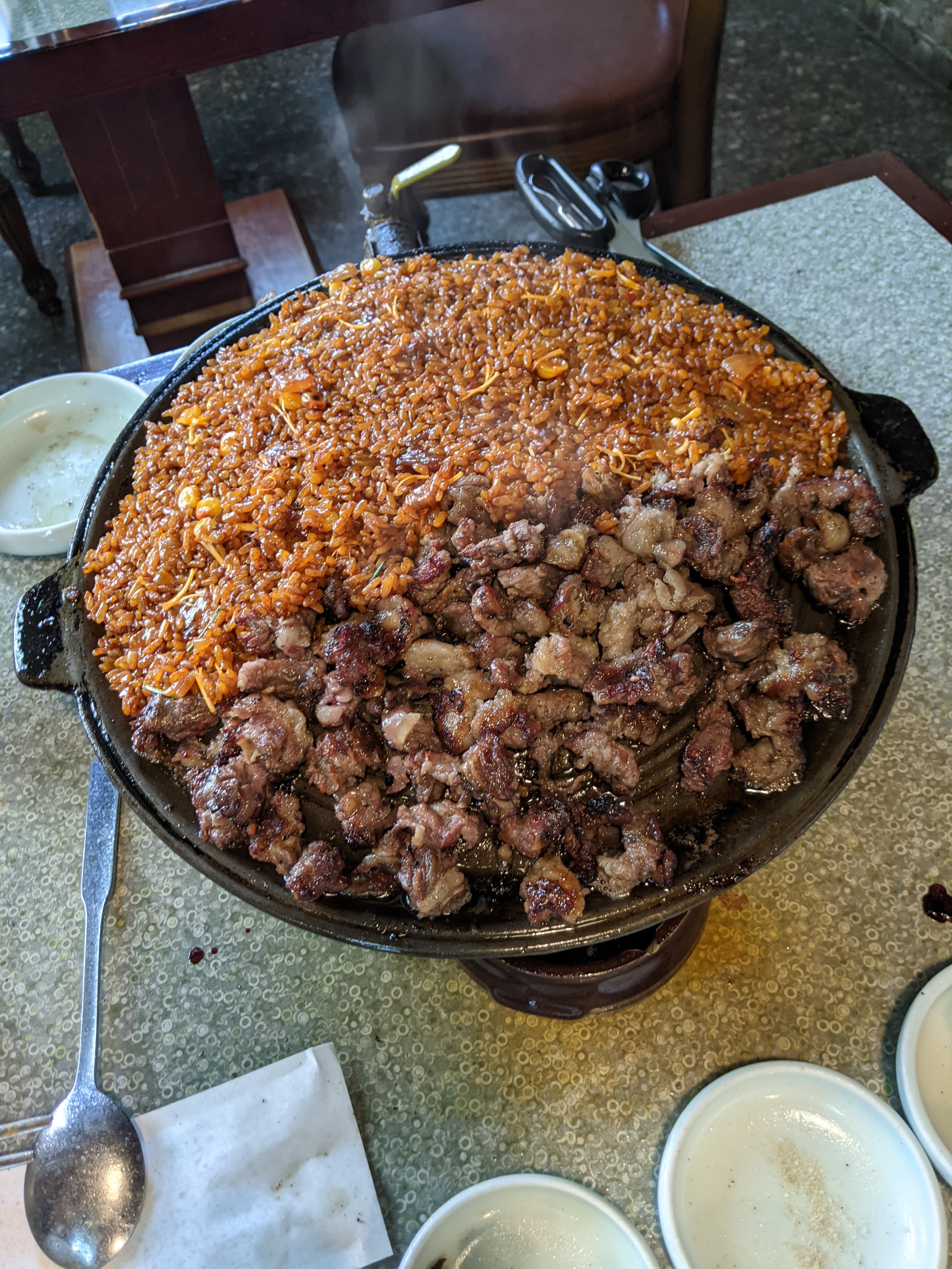 볶음밥이랑 남은 고기랑 같이 불판에 올려준다. 뼈에 붙은 고기가 많이 질길 줄 알았는데 생각보다 괜찮았다. 이걸 의식해서인지 종업원들도 고기를 작게 잘라준다. 다만 3인분 치고는 양이 좀 적게 느껴졌고, 1인분에 5,000원이라 고깃집 볶음밥 치고는 가격이 있는 편이다.