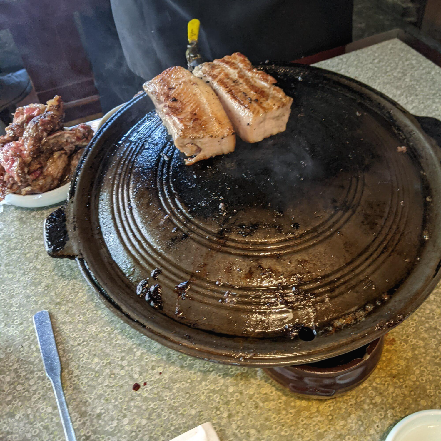 볶음밥 때문에 좀 갑분싸 돼서 엄마가 다른 것도 맛보자고 주문한 삼겹살 2인분 (150g*2, 15,000*2). 고기는 잘 굽던데 불판은 잘 못 닦는다. 삼겹살은 국내산이었고 당연히 맛있다.