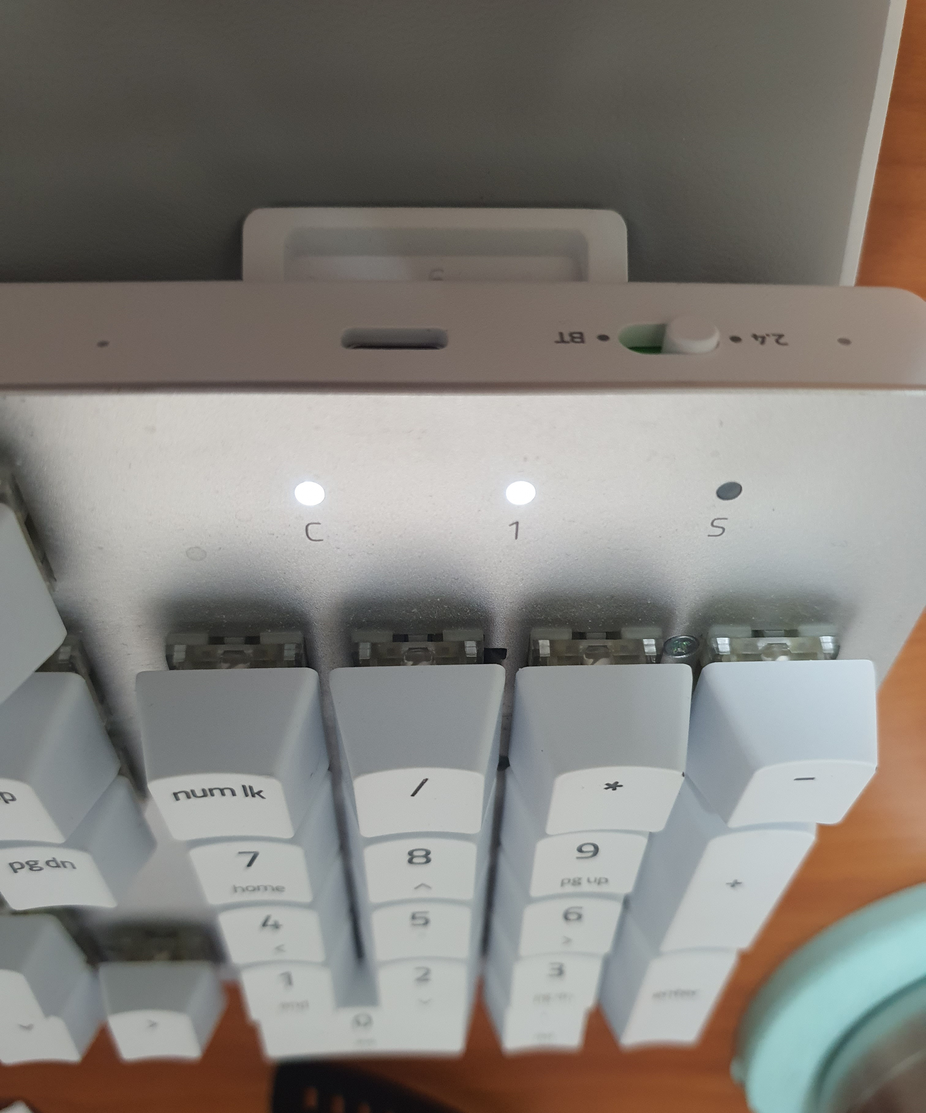 예를 들어, 1번에 연결하려고 하면, 스위치를 BT에 두고 fn 키+1을 누르면 C(caps lock) 불이 깜빡거릴 것이다. 이는 1번에 아무 장치도 연결이 안되어있다는 뜻이고, 연결을 하고나면 깜빡임이 멈춘다.