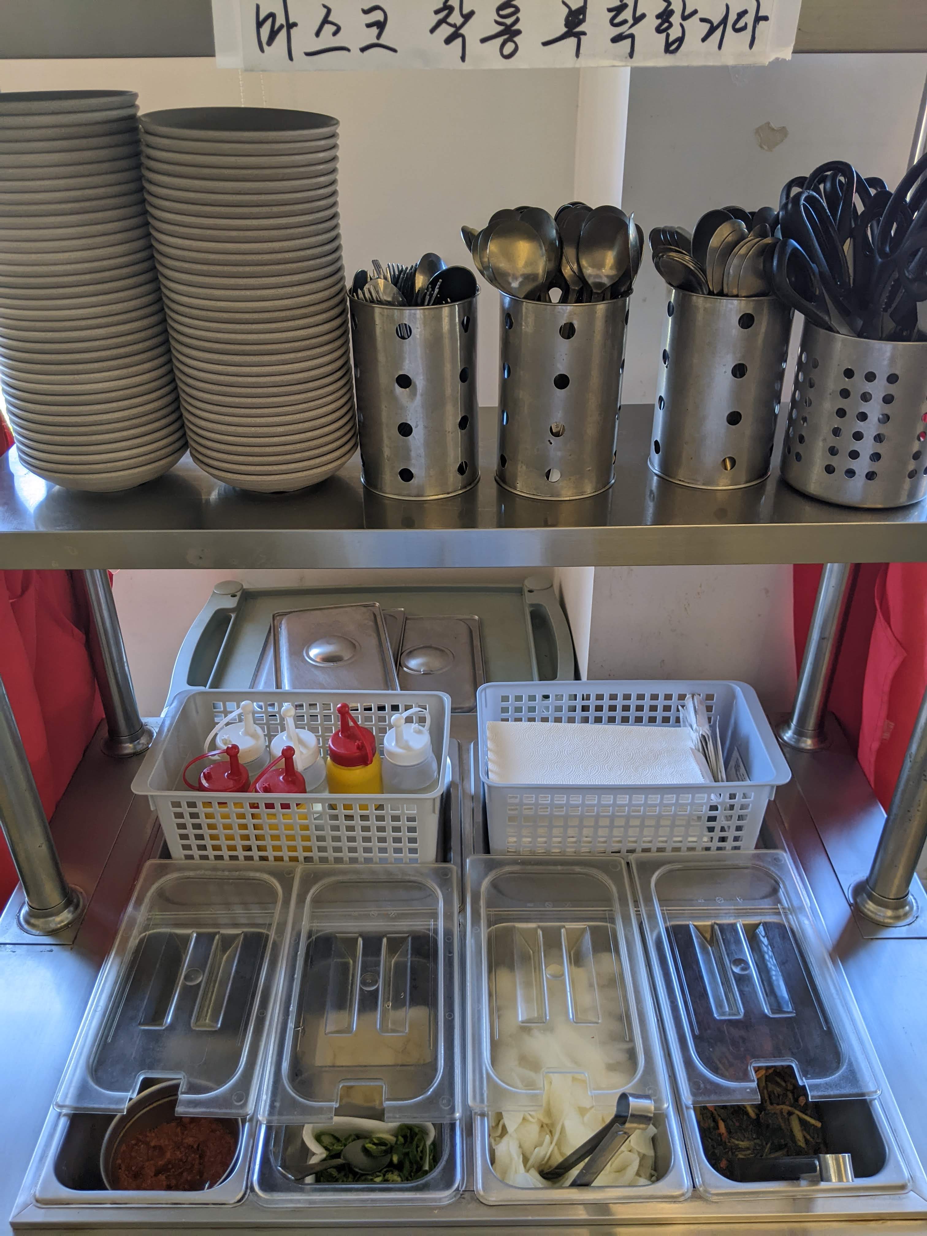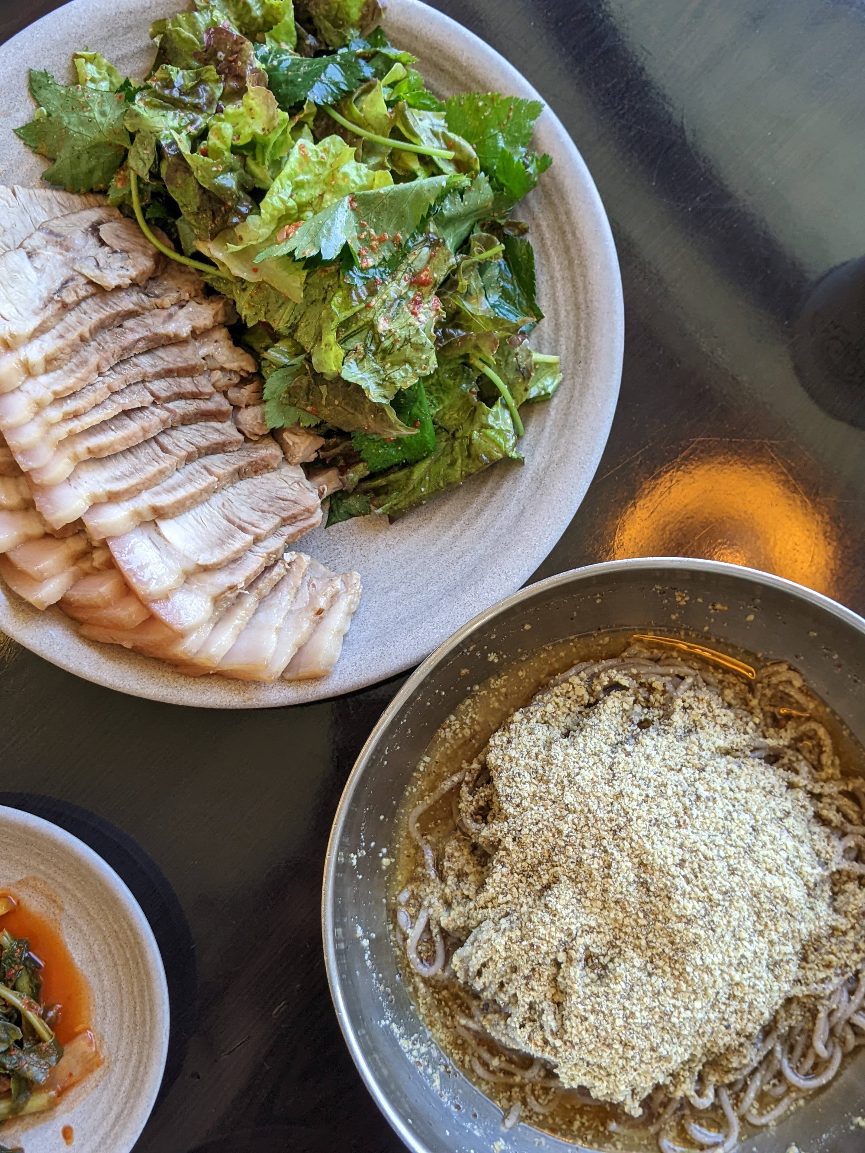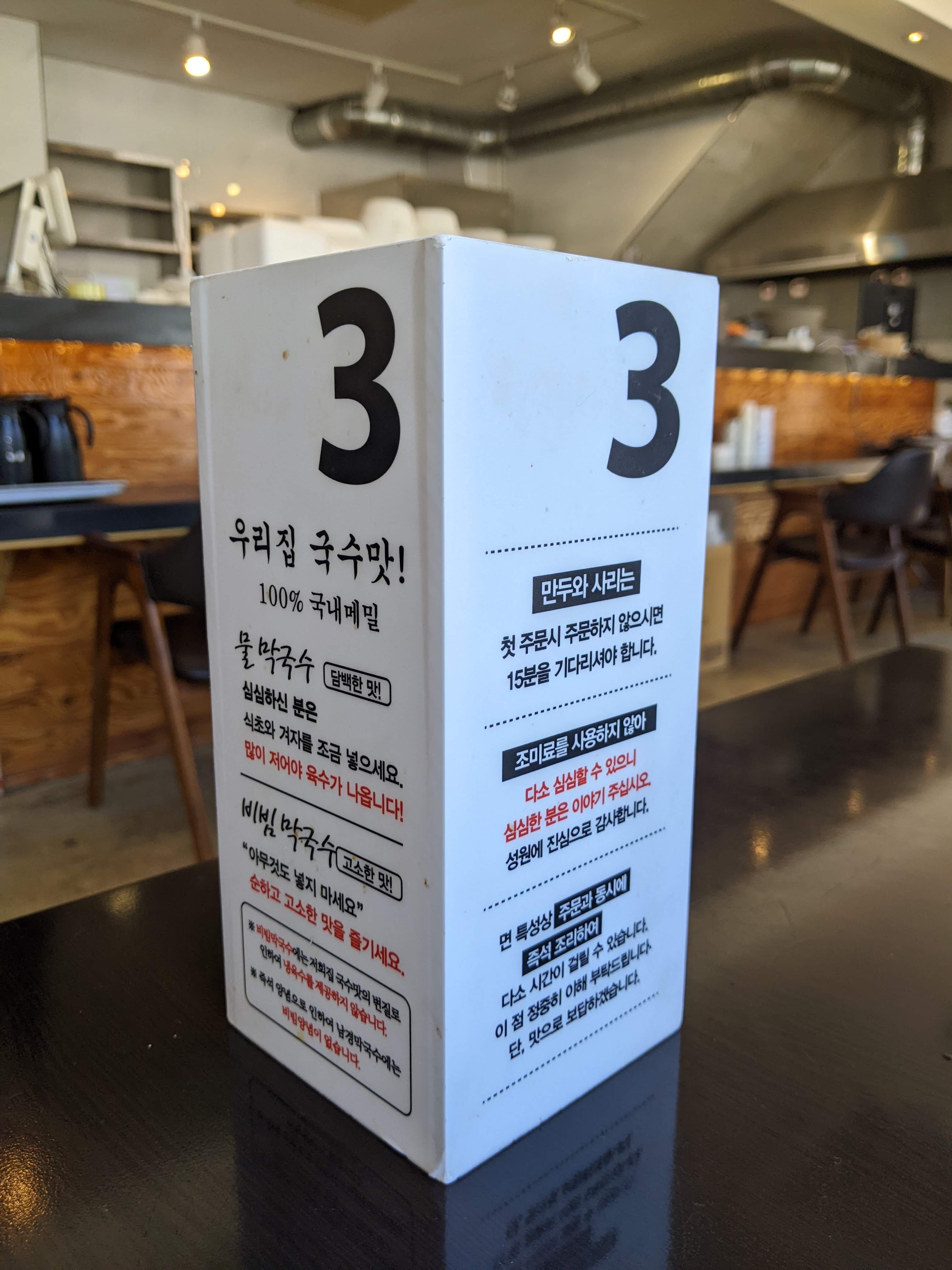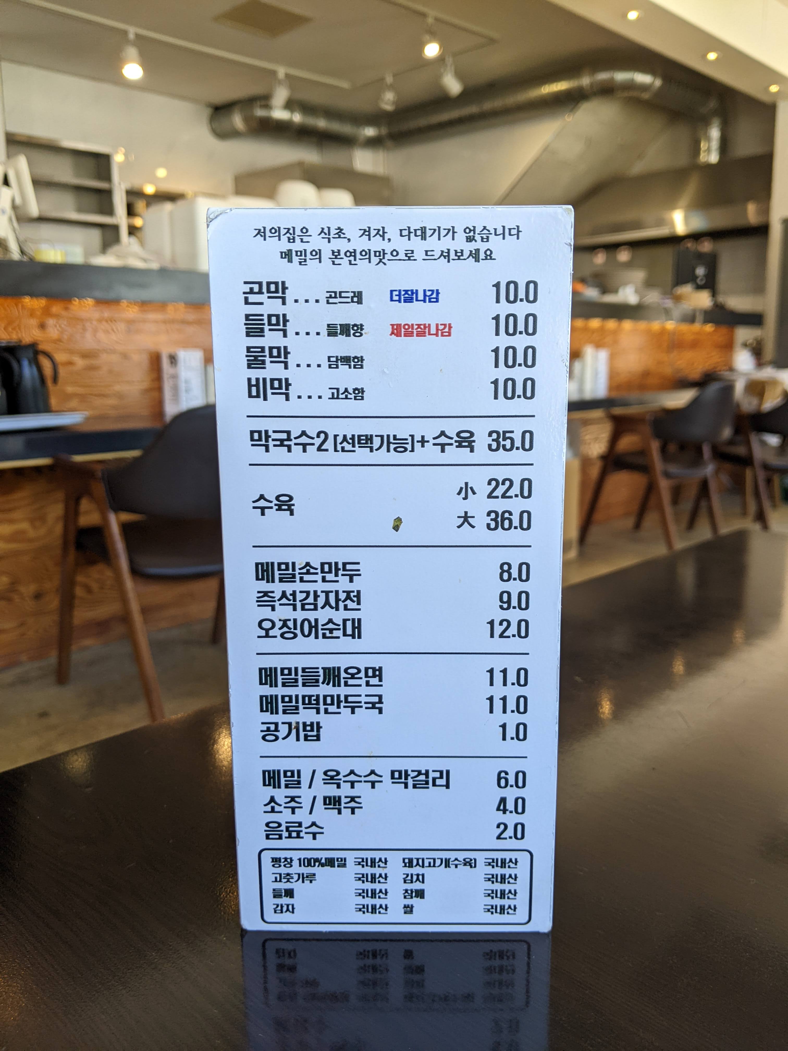 테이블마다 번호와 메뉴가 적힌 텐트가 있고, 2인 이상 오면 주로 막국수2+수육을 먹는 듯하다. 그런데 다른 사람들 식사하는 모습을 보니 세트로 주문하는 경우 수육의 양이 적어 보였고 엄청 배고프지도 않아서 들막 한 그릇에 수육 작은 사이즈를 하나 주문했다.
