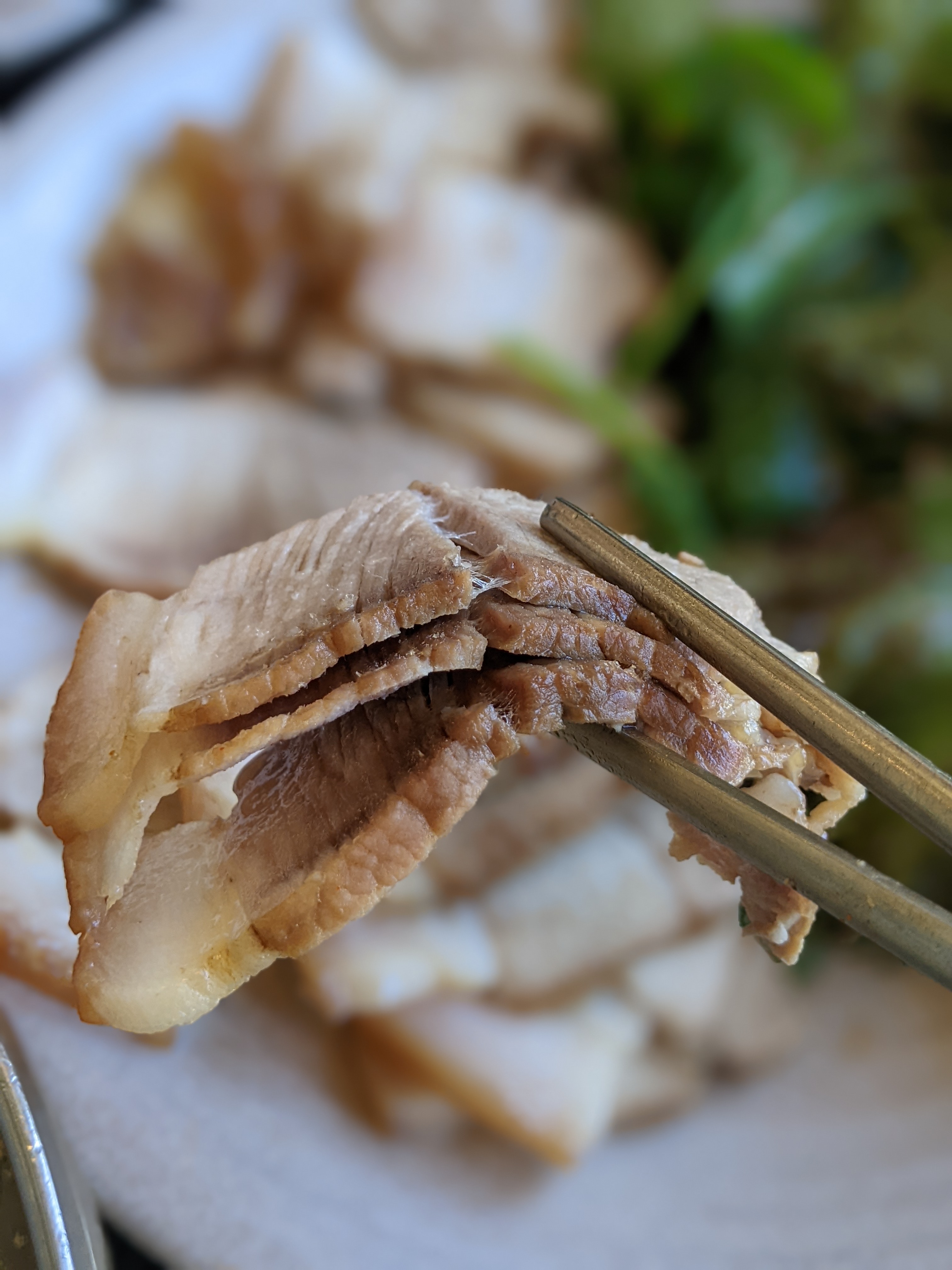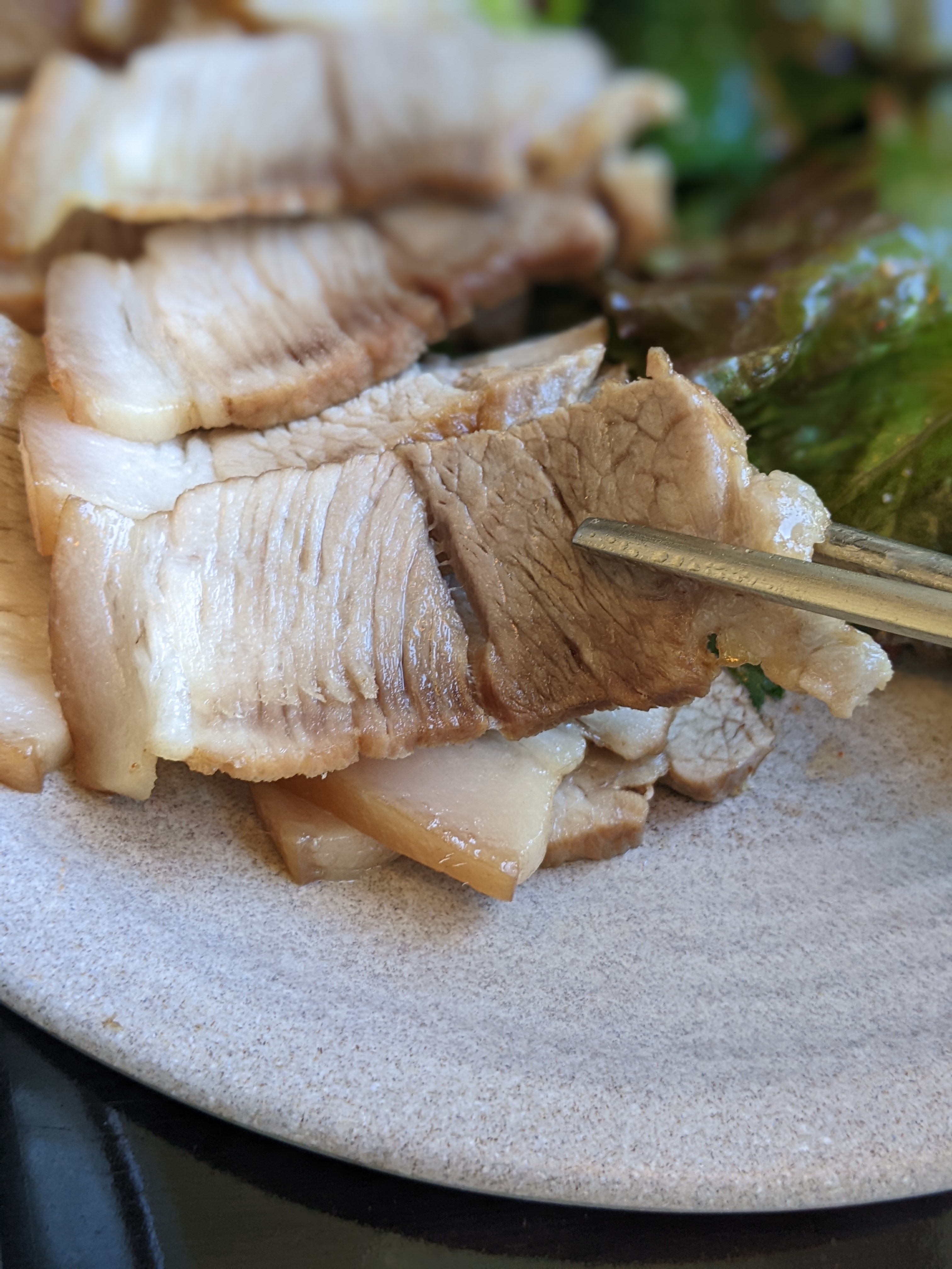 보통 수육(보쌈)집이면 삶은 고기 삶는 시간을 정해두고 하루에 여러 번 삶는데, 아침에 한 번에 많이 삶아 놓는 모양이다. 낮 시간에 손님들이 많이 주문하면 중간에 다시 한번 삶긴 하겠지만, 이 말 대로면 점심 장사가 잘 안된 날에는 저녁에 주문한 수육이 아침에 조리해 놓은 경우일 수도 있겠다.