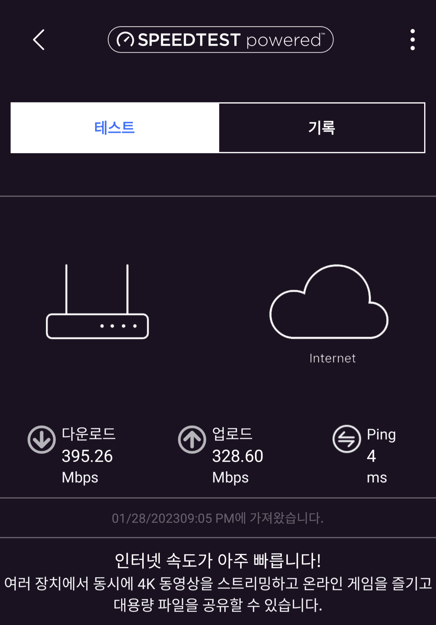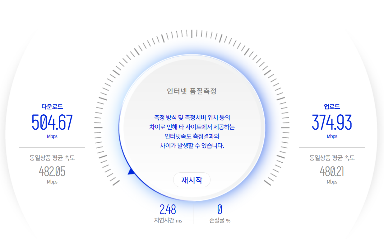 인터넷 속도 측정 결과는 무난하다. Speedtest를 통해 인터넷 속도 측정하는 것은 서버가 해외에 있어 500Mbps가 아무래도 다 나오기는 무리였지만, 인터넷정보진흥원 홈페이지를 통한 속도측정은 오히려 500Mbps를 넘는 다운로드 속도를 보여주었다.