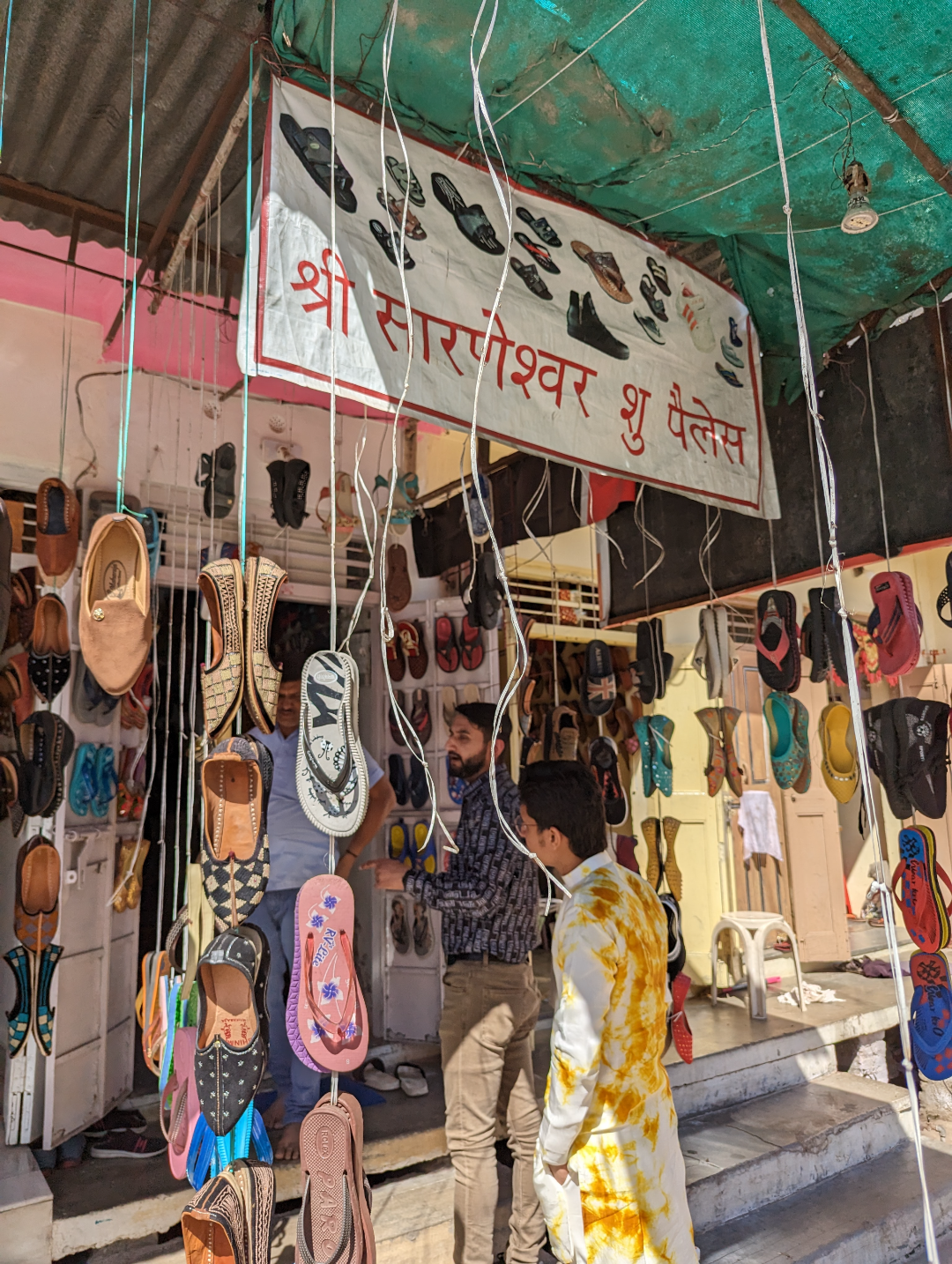 아침을 먹고 결혼식 장에 가기 전에 신발을 사러 갔습니다. 근처에서 가장 큰 도시인 Pindwara라는 곳입니다. 우리나라로 치면 읍내 정도 되는 것 같습니다. 전통 의상은 결혼하는 친구가 준비해줬는데, 신발이 없어서 기념품으로 챙길 겸 사기로 했습니다. 한화로 3000원 정도에 가죽으로 된 신발을 구매했습니다.
